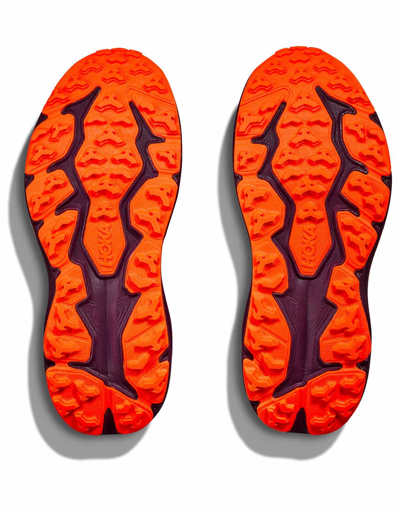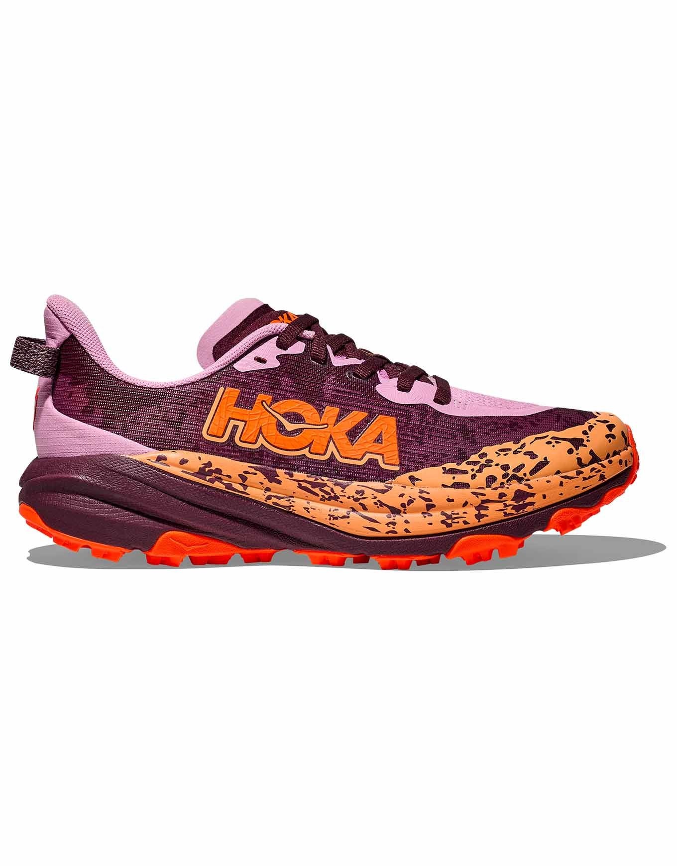 Chaussure de trail Hoka Speedgoat 6 Youth Flower Nectar/Neon Tangerine, conçue avec Karl Meltzer pour les jeunes runners : stabilité renforcée, semelle large 4,5 mm en caoutchouc Durabrasion, mesh double couche respirant, chaussage facile.