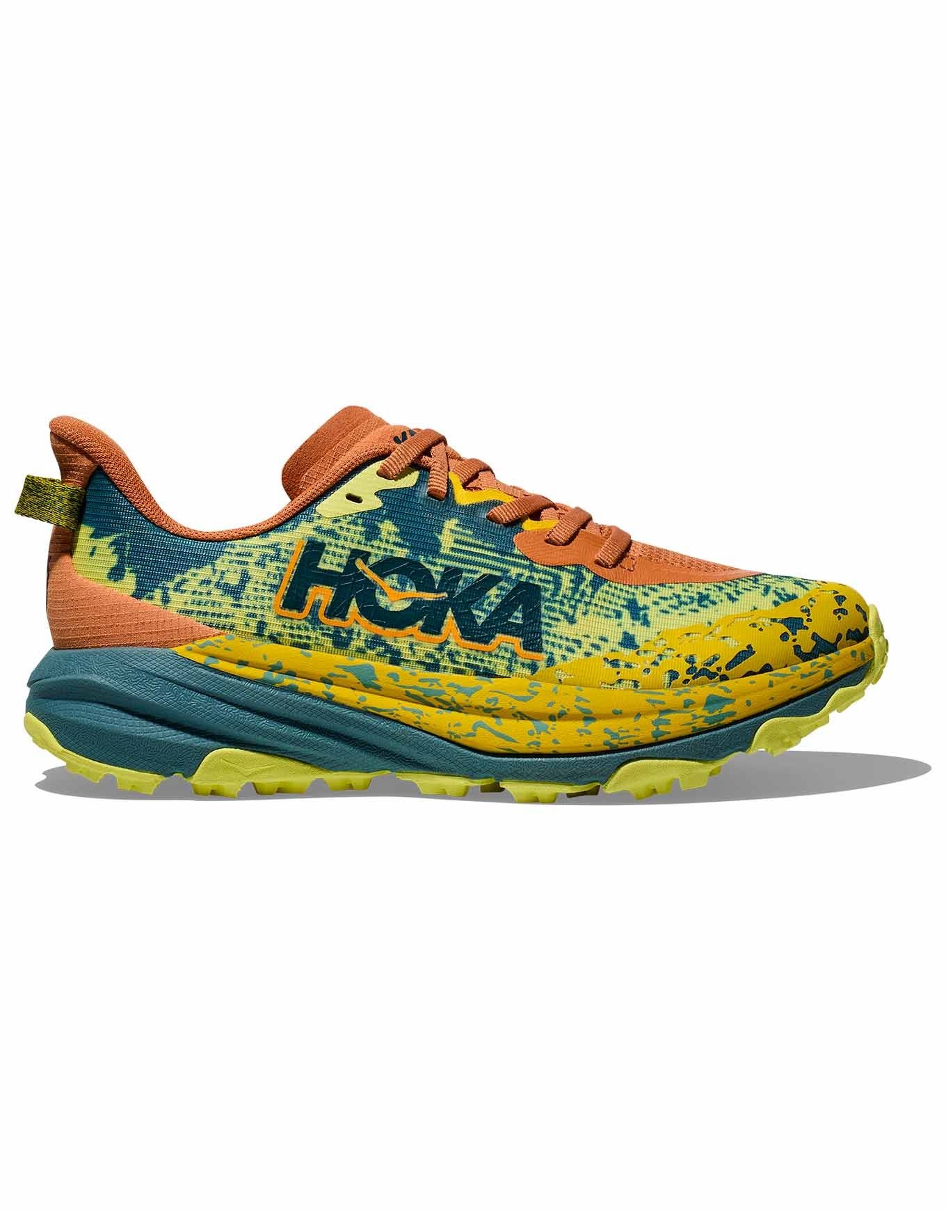 Chaussure de trail Hoka Speedgoat 6 Y Terra Cotta/Mountain Fog pour enfant, conçue avec Karl Meltzer : semelle large, mesh double couche respirant, crampons 4,5 mm en caoutchouc Durabrasion pour stabilité, traction et confort sur tous terrains.