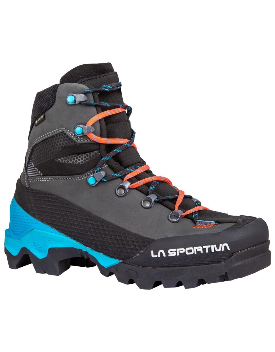 Chaussure d’alpinisme femme La Sportiva Aequilibrium LT GTX en cuir nubuck hydrofuge avec membrane GORE-TEX, légère et rigide, compatible crampons semi-automatiques, confort de marche et freinage optimisés par la technologie Double Heel™, semelle Vibram® et Impact Brake System.
