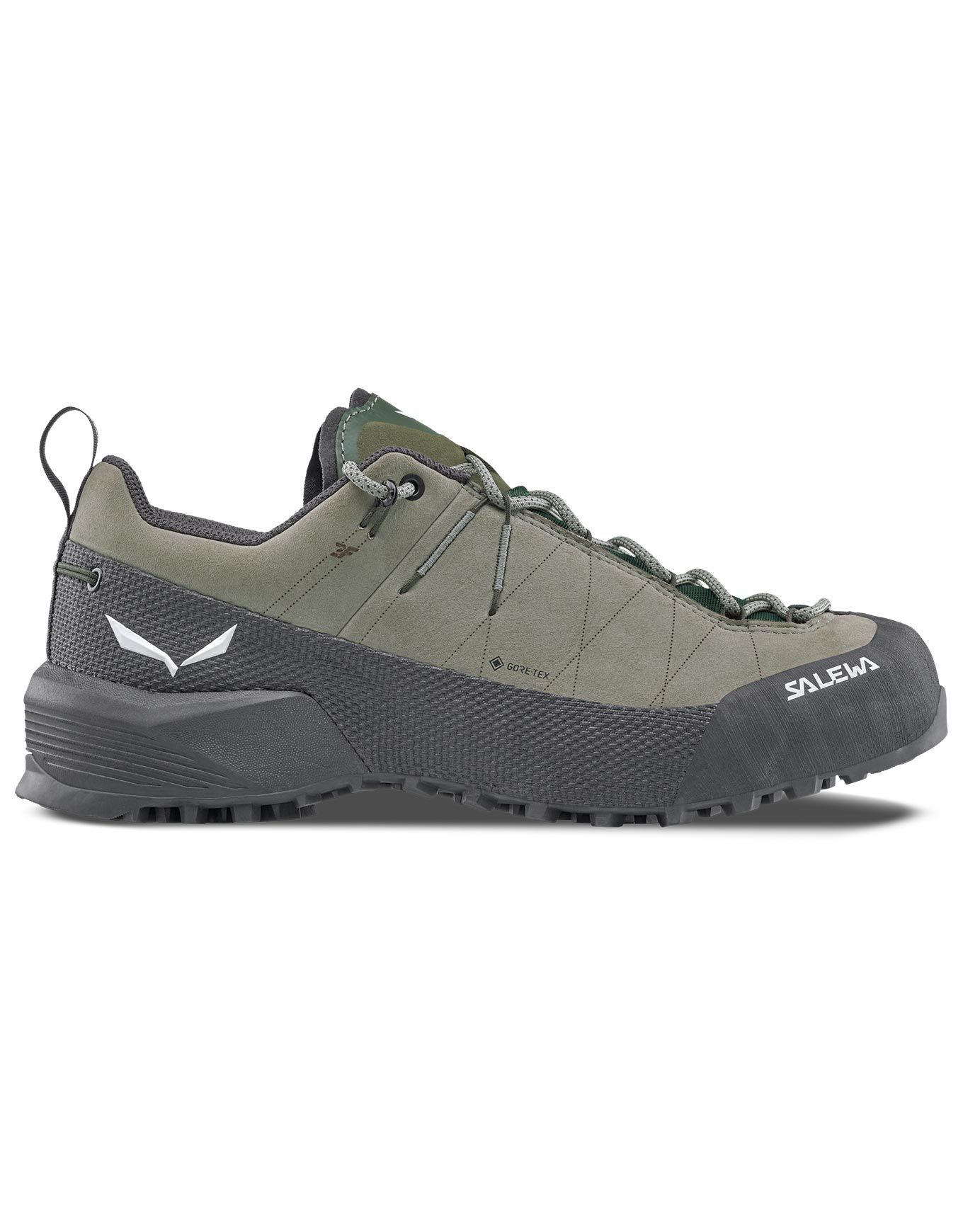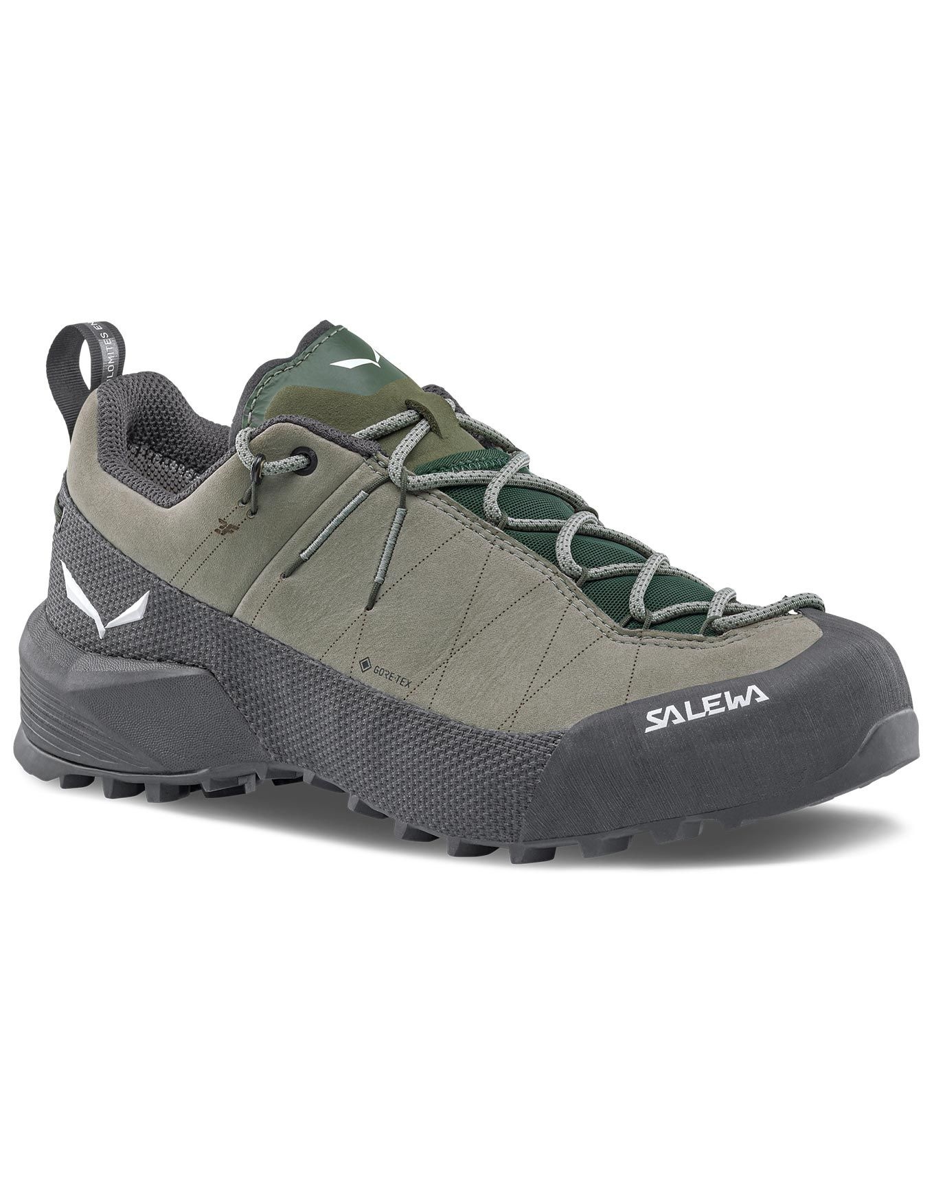 Chaussures d’approche et d’escalade femme Salewa Wildfire Leather 2 GTX Shadow/Black, en nubuck avec doublure GORE-TEX sans PFAS pour imperméabilité et respiration, semelle POMOCA® adhérente et C.F.F. personnalisable pour précision et maintien.