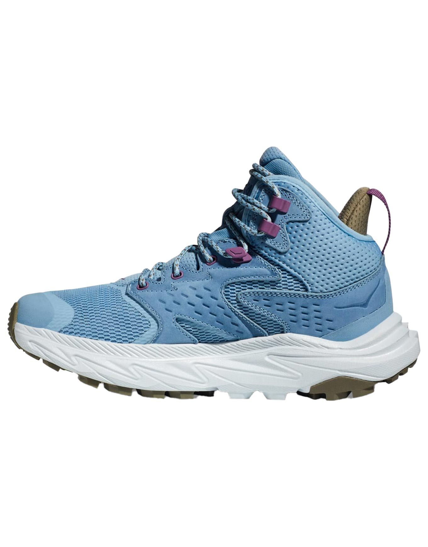 Chaussure de randonnée journée Hoka Anacapa 2 Mid GTX pour femme, en mesh recyclé ultra-aéré, Gore-Tex imperméable, semelle Vibram MegaGrip et mousse EVA à base de canne à sucre pour légèreté, confort et accroche.
