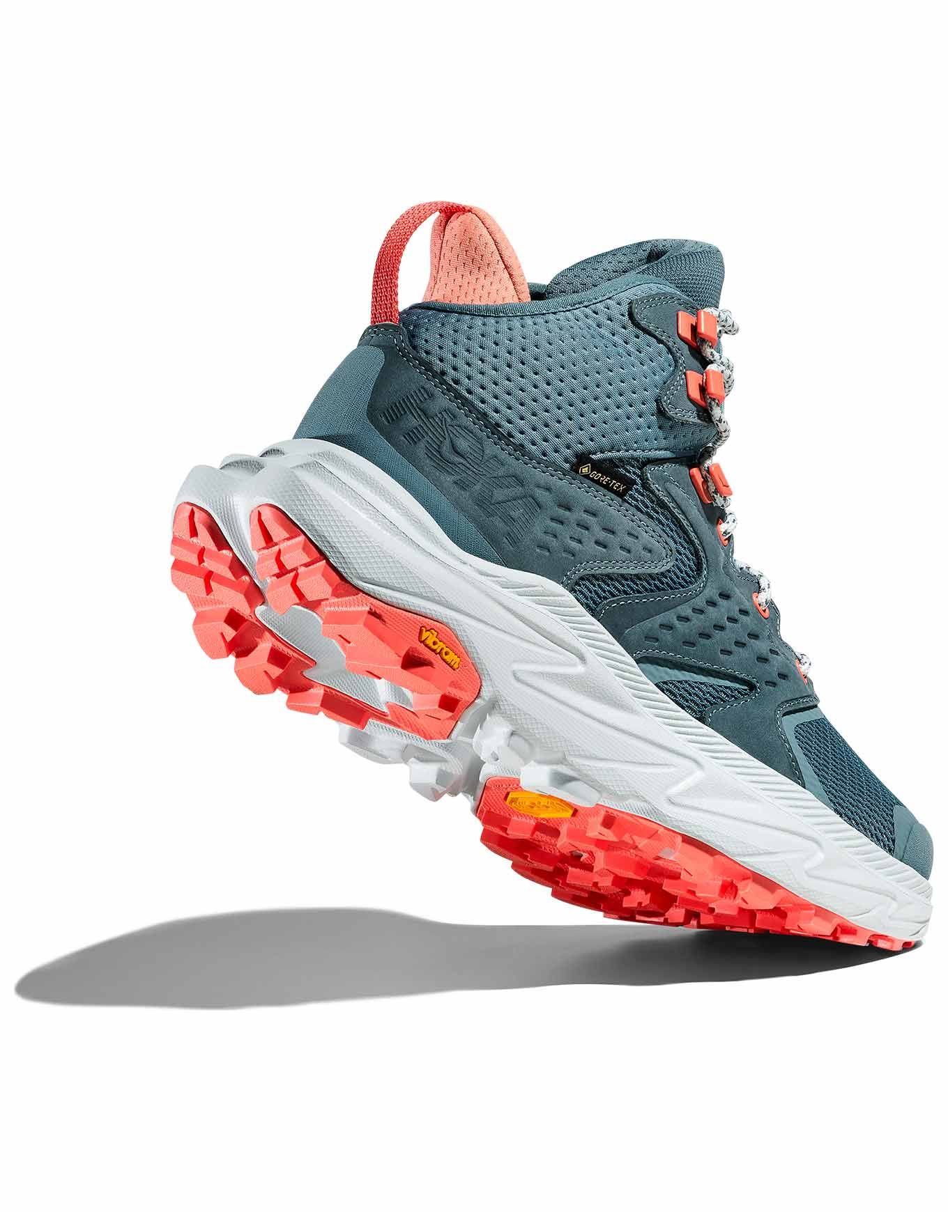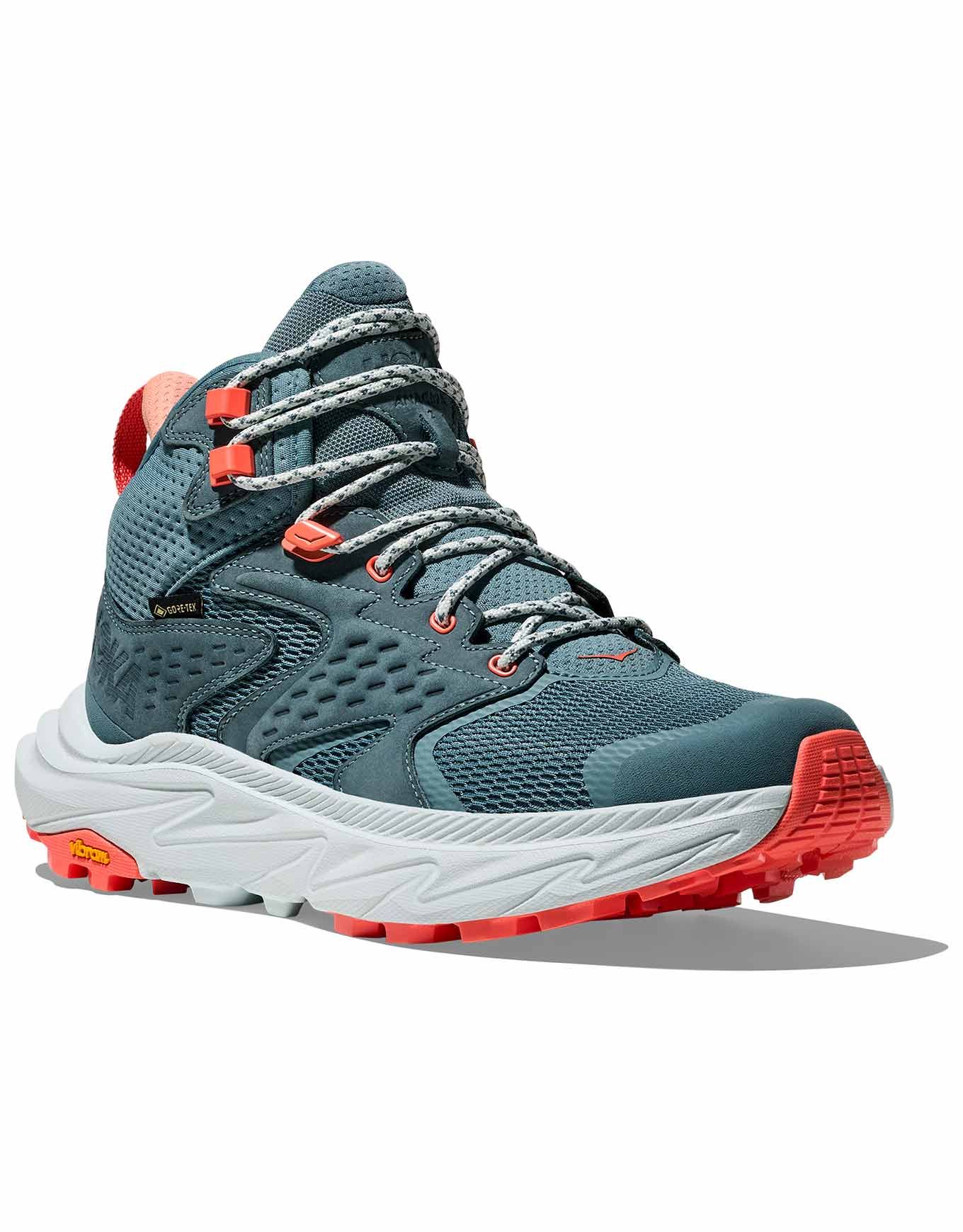 Anacapa 2 Mid GTX Mountain Fog/Droplet, chaussure de randonnée journée femme Hoka, allie légèreté, respirabilité en mesh recyclé, imperméabilité GORE-TEX et accroche Vibram MegaGrip pour des sorties dynamiques par tous les temps.