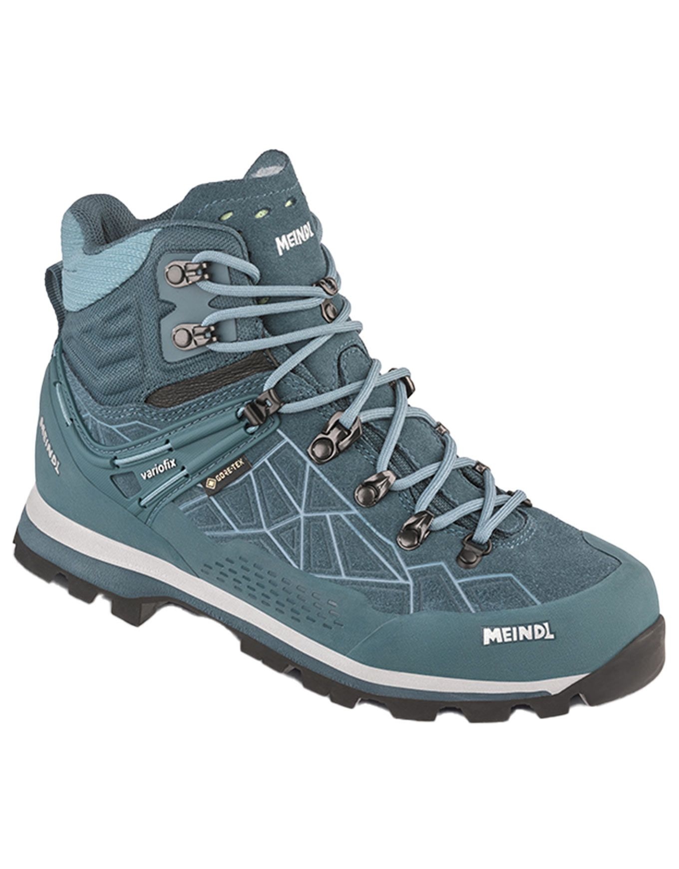 Chaussure de randonnée femme Meindl Lite Summit Lady GTX Turquoise/Ice en cuir suede et mesh, membrane GORE-TEX imperméable, semelle Vibram Multigrip 3 Alpin Light, légère et stable pour journées en montagne.