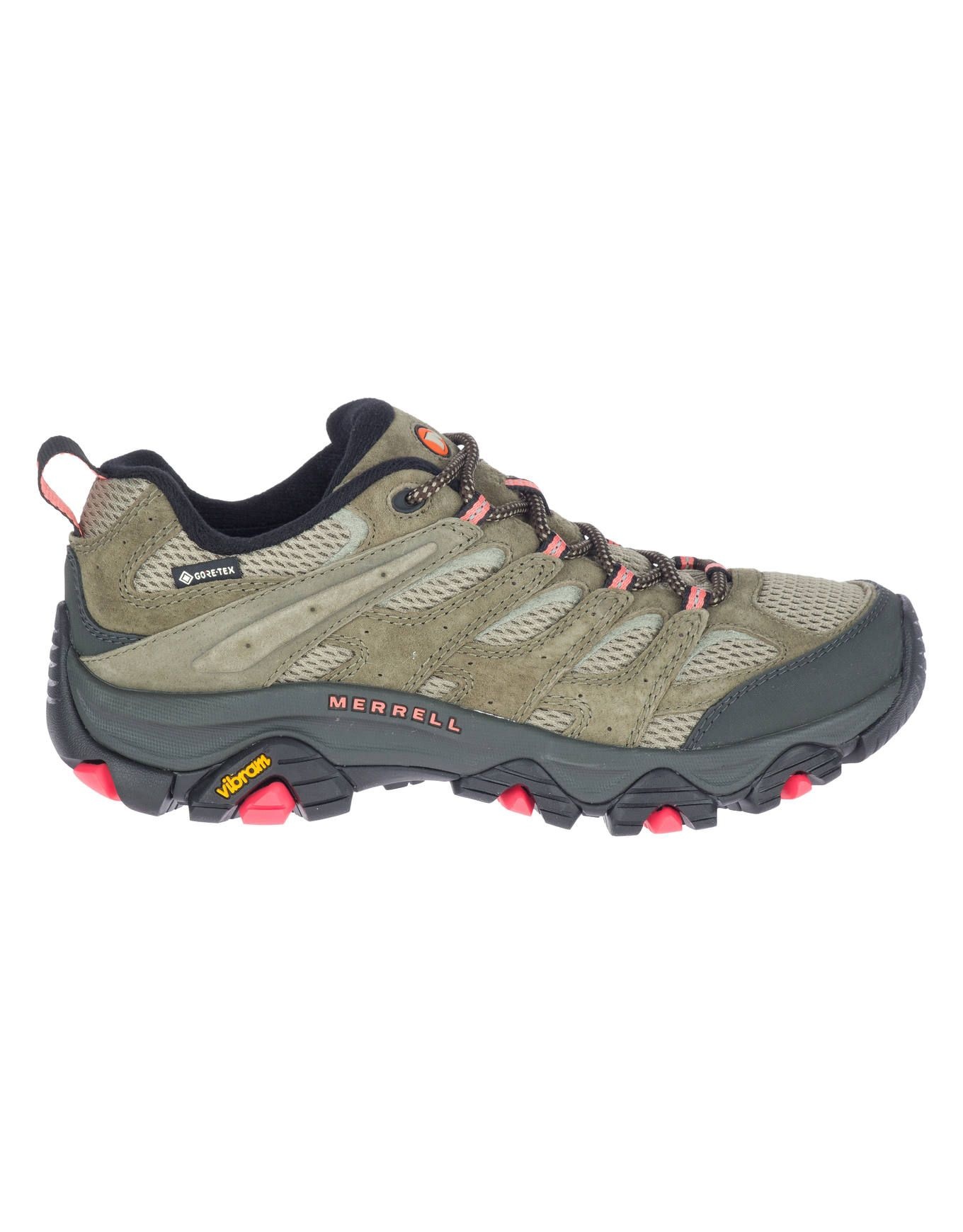 Chaussure de randonnée femme Merrell Moab 3 GTX Olive avec membrane GORE-TEX, semelle intérieure Kinetic Fit™ ADVANCED, intercalaire EVA légère et semelle Vibram® adhérente partiellement recyclée.