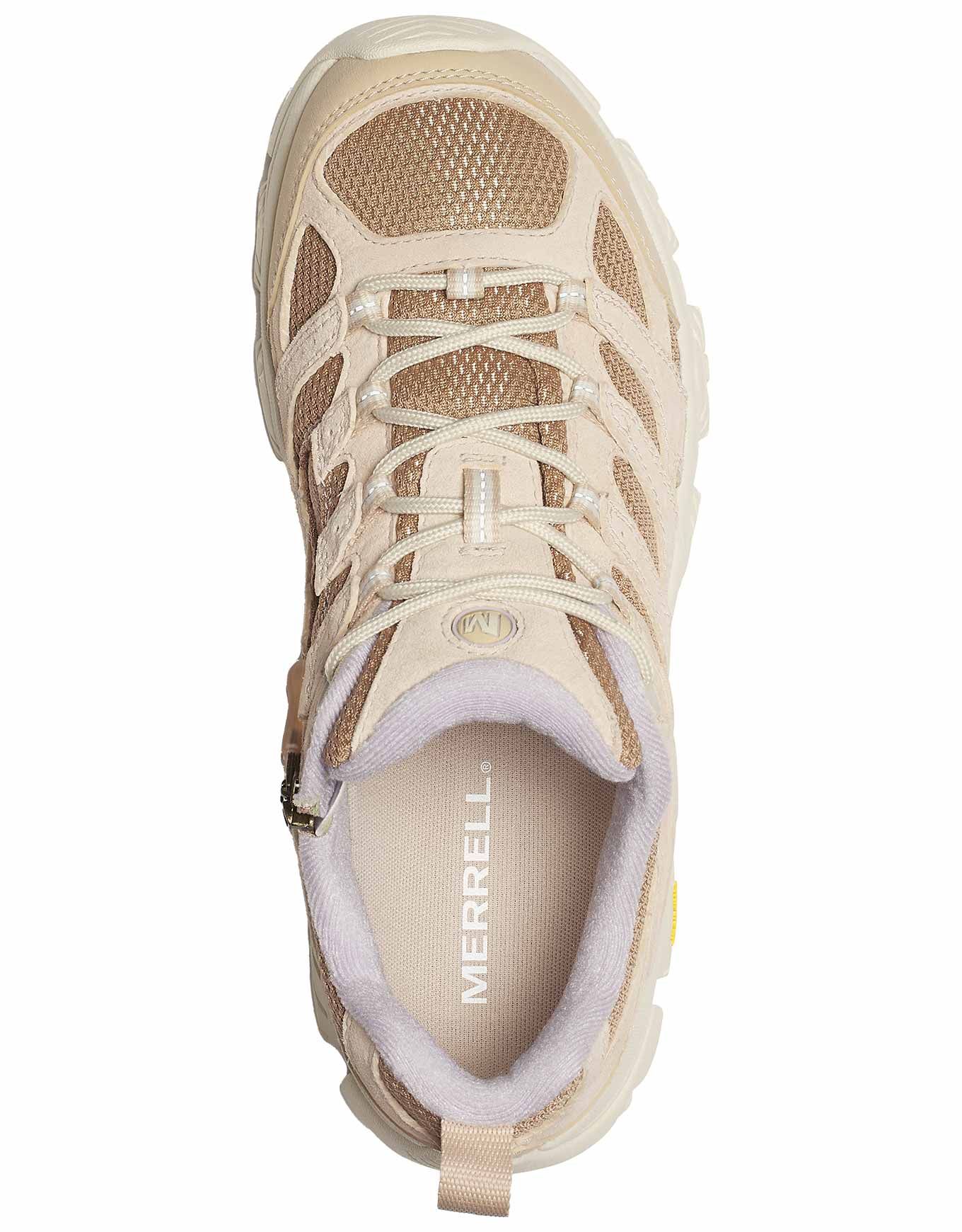 La chaussure de randonnée femme Merrell Moab 3 Ready Zip Hazel allie fermeture zip+lacets, semelle Vibram® adhérente en matériaux recyclés, Kinetic Fit™ ADVANCED et intermédiaire souple pour légèreté, amorti et respirabilité sur courtes distances.