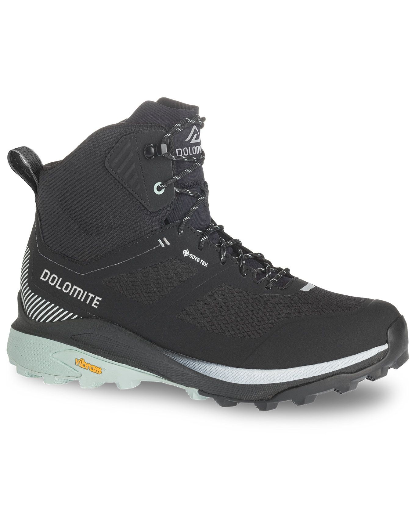 Chaussures de randonnée Dolomite W’s Nibelia High GTX Black Mint Green, tige montante Gore-Tex imperméable, semelle Vibram XS Trek pour adhérence et légèreté, forme spécifique femme.