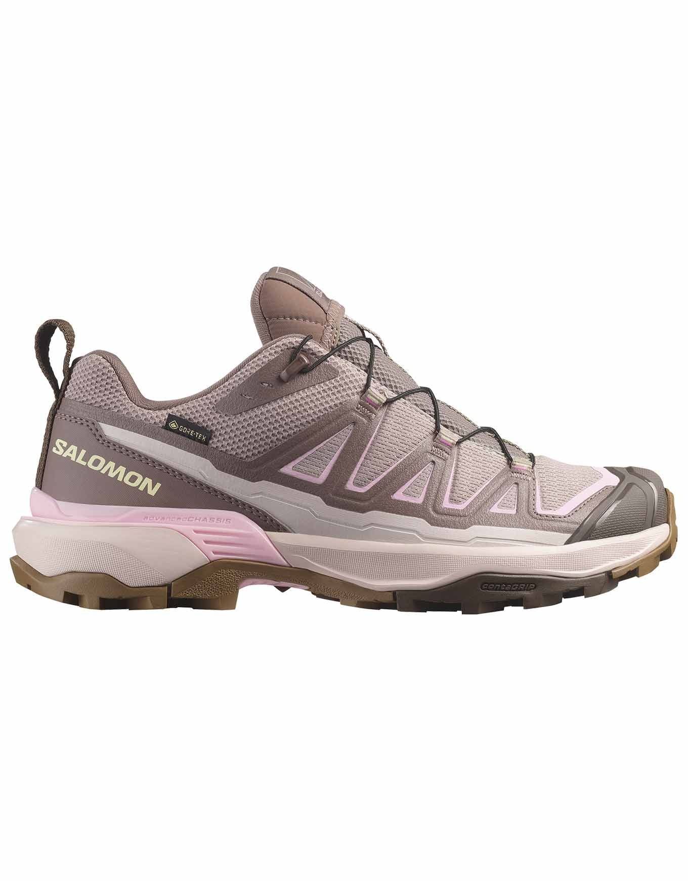 Chaussure de randonnée femme Salomon X Ultra 360 Edge GTX Iron/Etherea, imperméable GORE-TEX, chassis ADV-C pour stabilité en descente, accroche All Terrain Contagrip®, confort OrthoLite™ et protection pare-pierres.