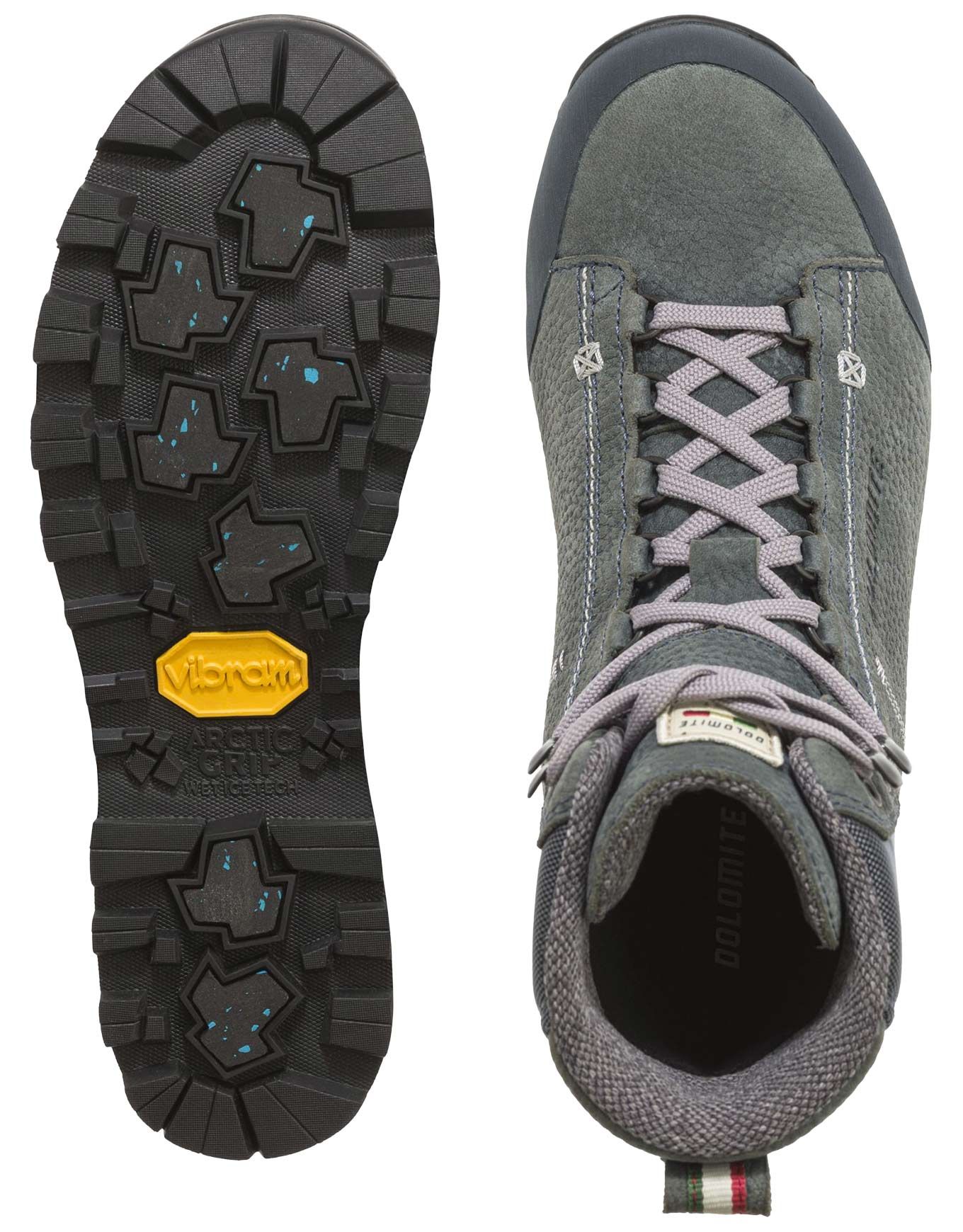 La chaussure Dolomite Cinquantaquattro Warm WP pour femme combine cuir poli huilé, doublure Primaloft et semelle Vibram avec Arctic Grip pour chaleur, confort et adhérence sur terrains glacés en ville ou en forêt.