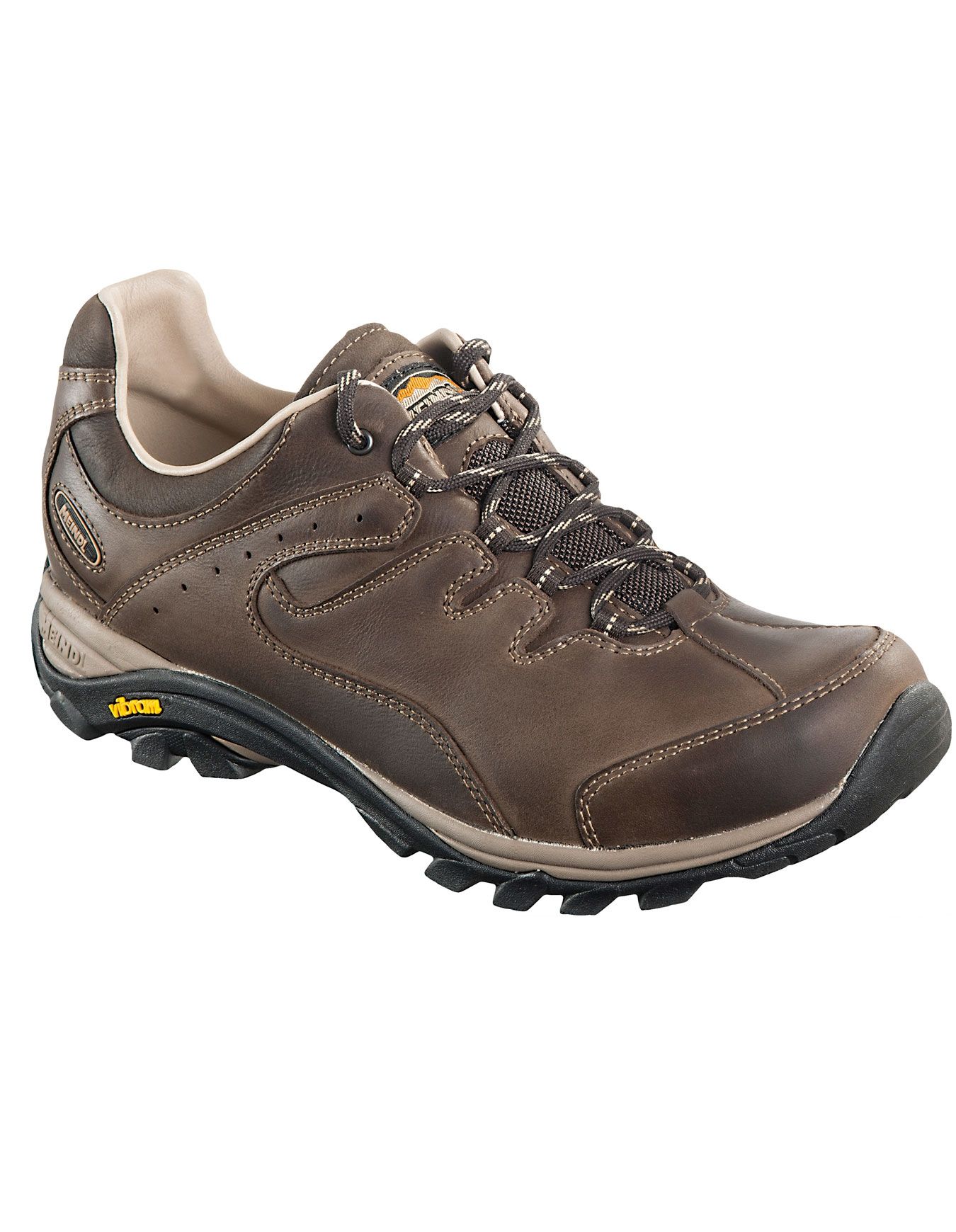 Chaussure Meindl Caracas Dark Brown pour homme, conçue pour balades et petites randonnées en ville ou sur terrains faciles. Tige basse en cuir Nubuck, doublure cuir, semelle Vibram® Urban Walker, 900 g la paire.