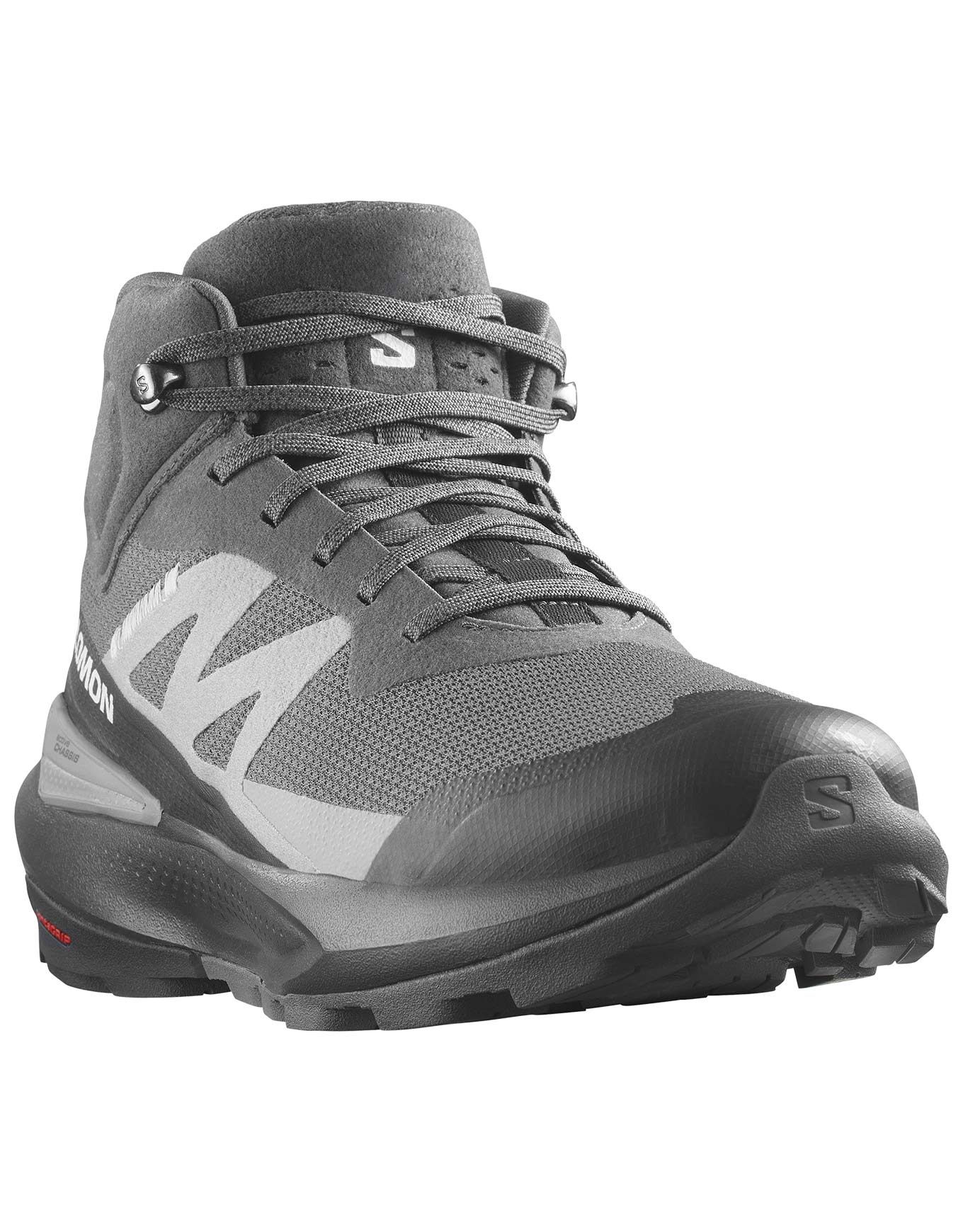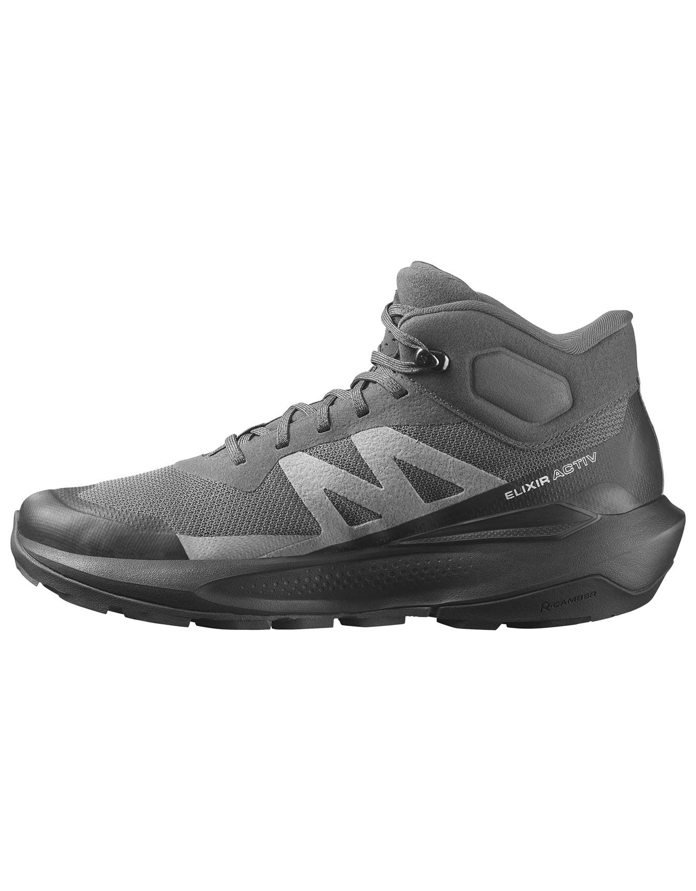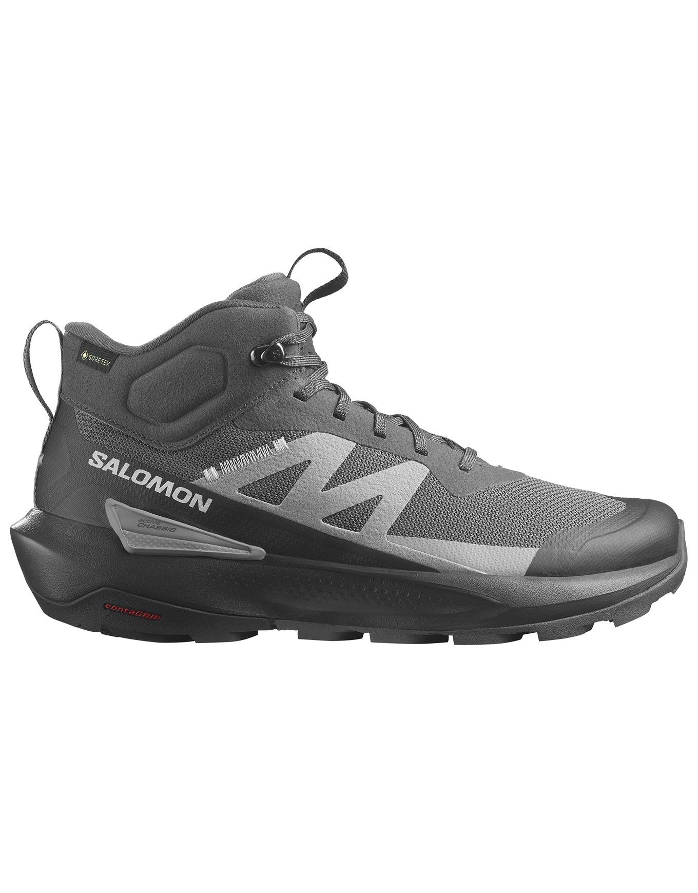 Chaussure de randonnée mi-haute Salomon Elixir Activ Mid GTX pour homme, conçue pour les longues distances : membrane GORE-TEX imperméable, semelle Contagrip® à crampons agressifs, chassis Active Chassis™ et SensiFit™ pour stabilité et maintien précis.