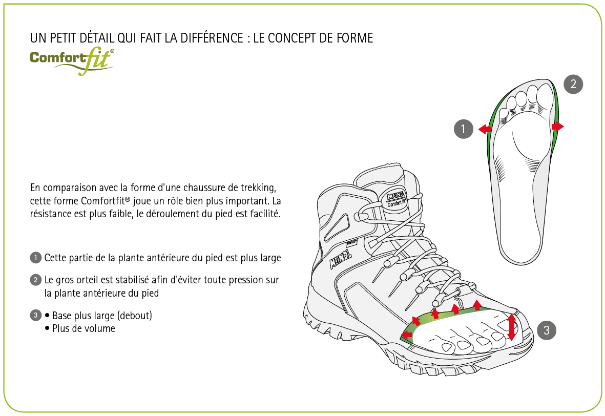 Intégrée à la gamme Comfortfit®Un volume de pied plus généreux est proposé par cette chaussure, particulièrement à l’avant, tant en hauteur qu’en largeur. La cheville et le talon bénéficient d’un maintien précis, exempt de points de pression. La flexion du cou-de-pied est améliorée par une languette souple en cuir.