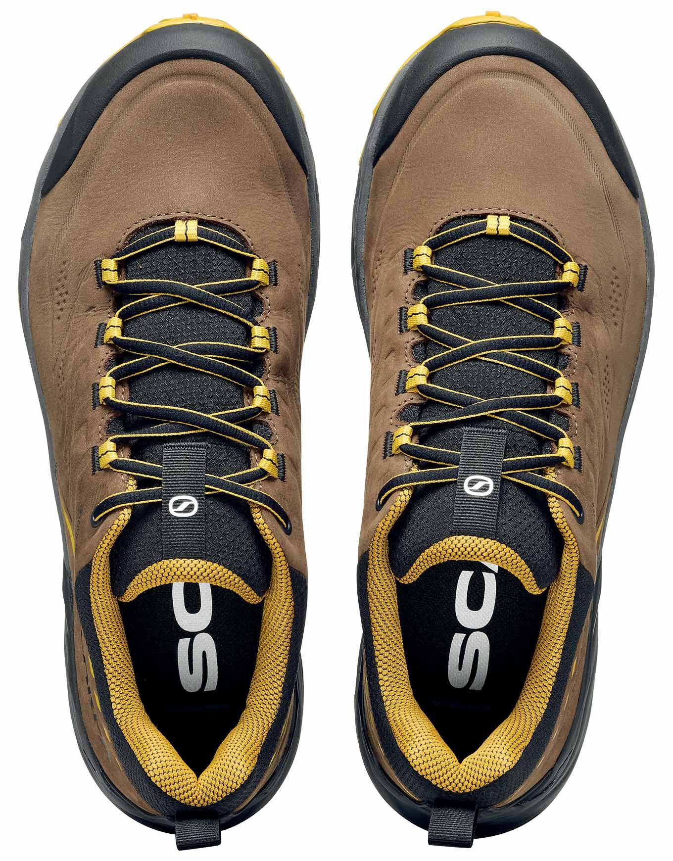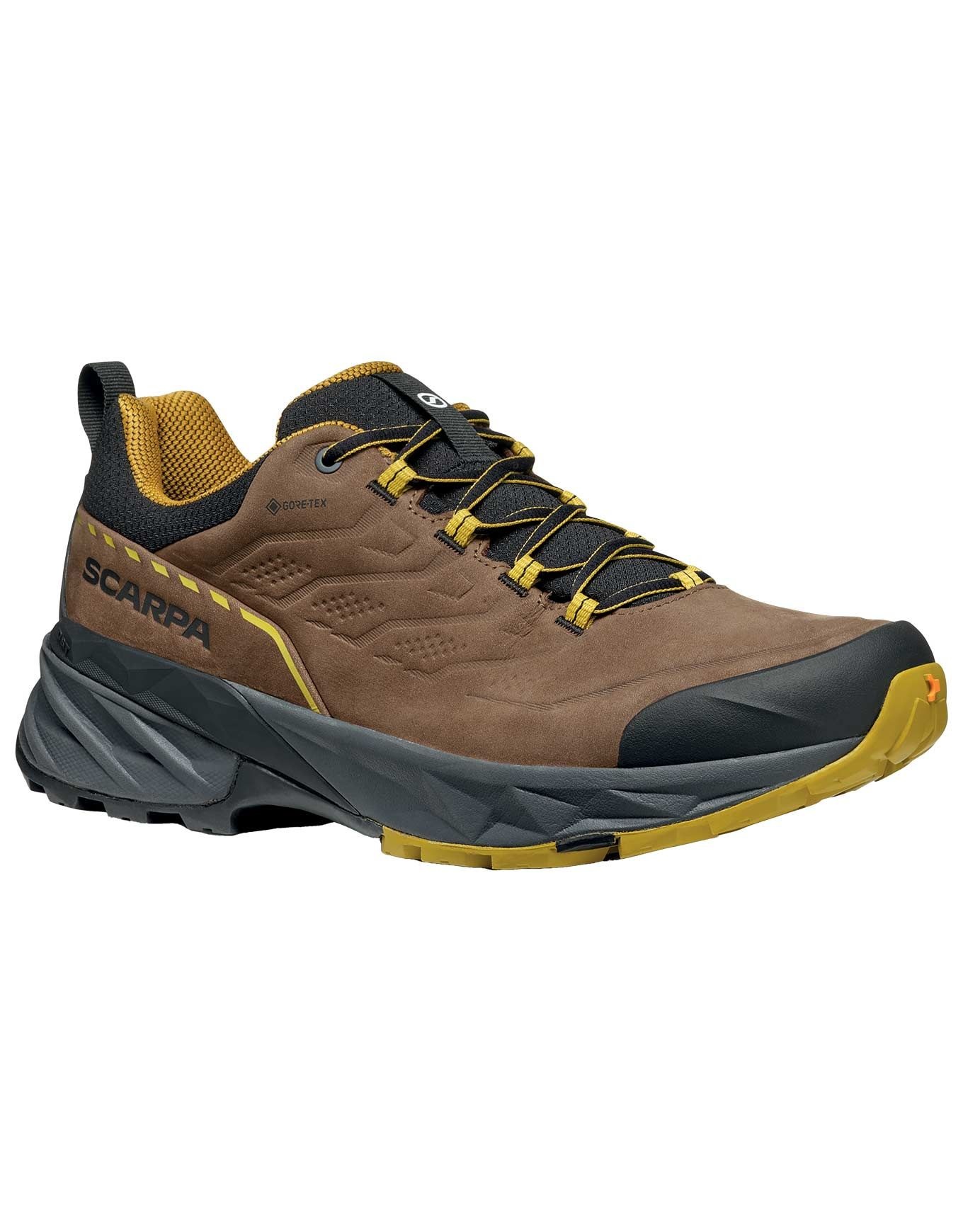 Les chaussures de randonnée Scarpa Rush 2 Pro GTX Brown Sulphur pour homme allient agilité et stabilité grâce à un talon rigide en TPU, un amorti EVA et une membrane Gore-Tex® imper-respirante à faible impact.