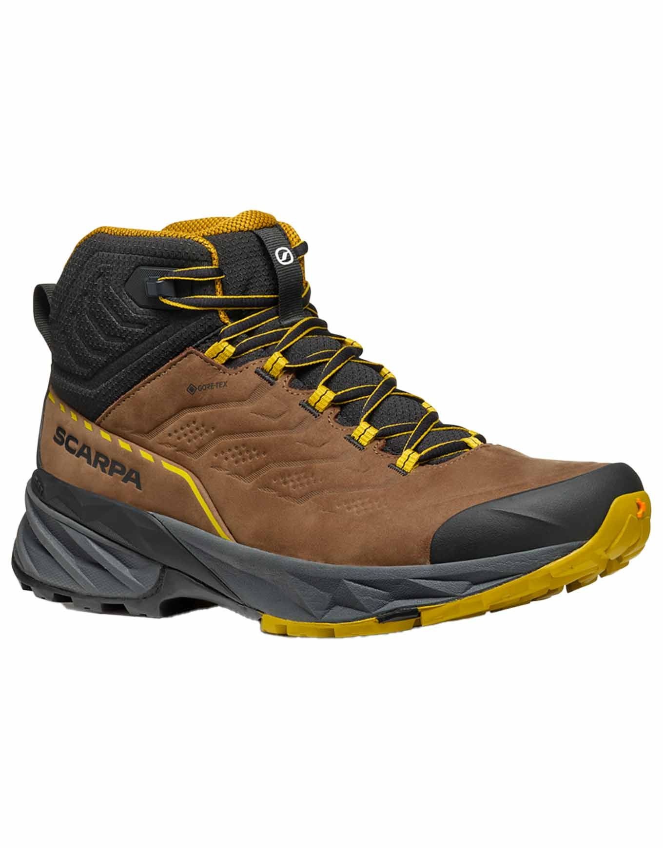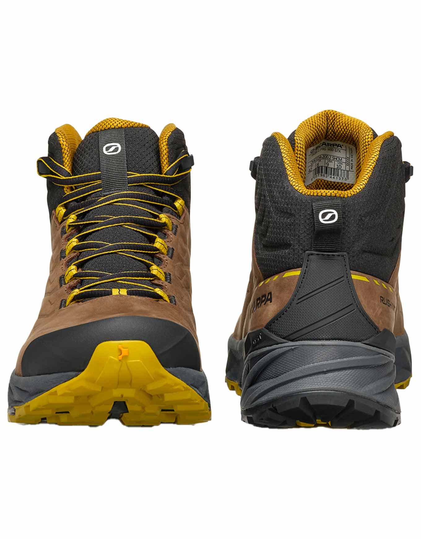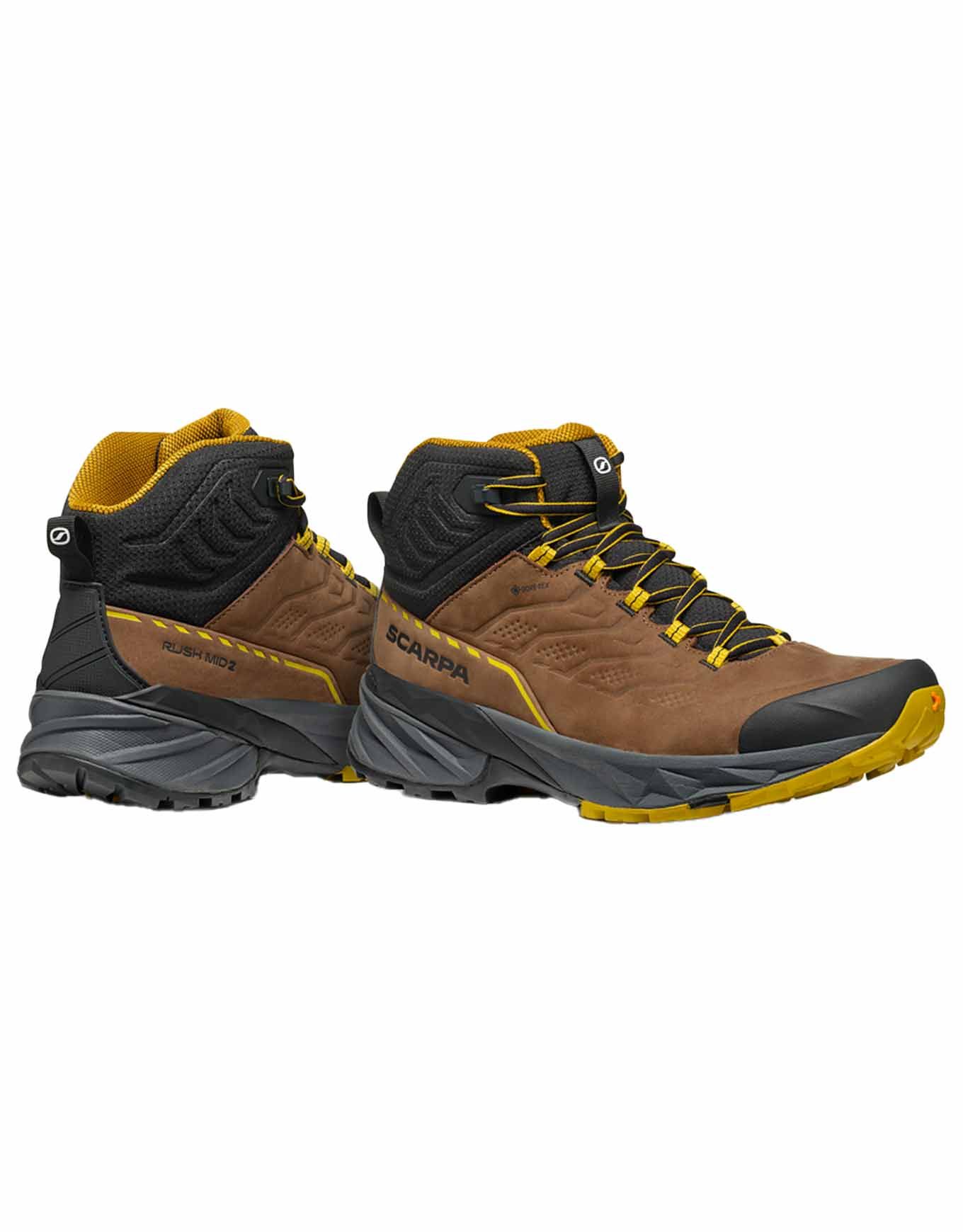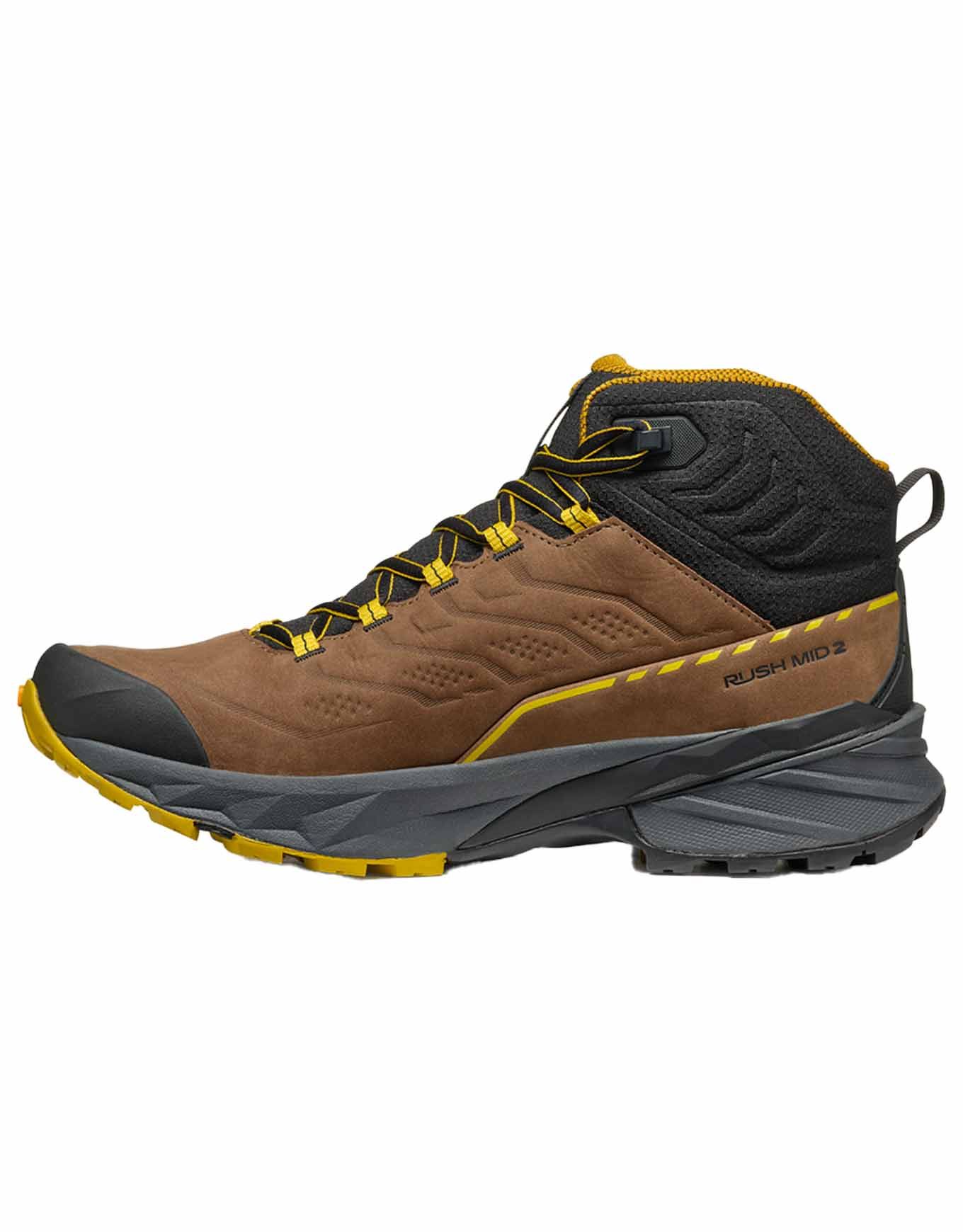 Scarpa Rush 2 Pro Mid GTX Brown Sulphur, chaussure de randonnée homme, allie agilité et stabilité avec son talon TPU rigide, sa tige mi-haute en cuir nubuck, sa membrane Gore-Tex® ePE respirante et sa semelle EVA amortissante pour des sorties à la journée en toute sérénité.