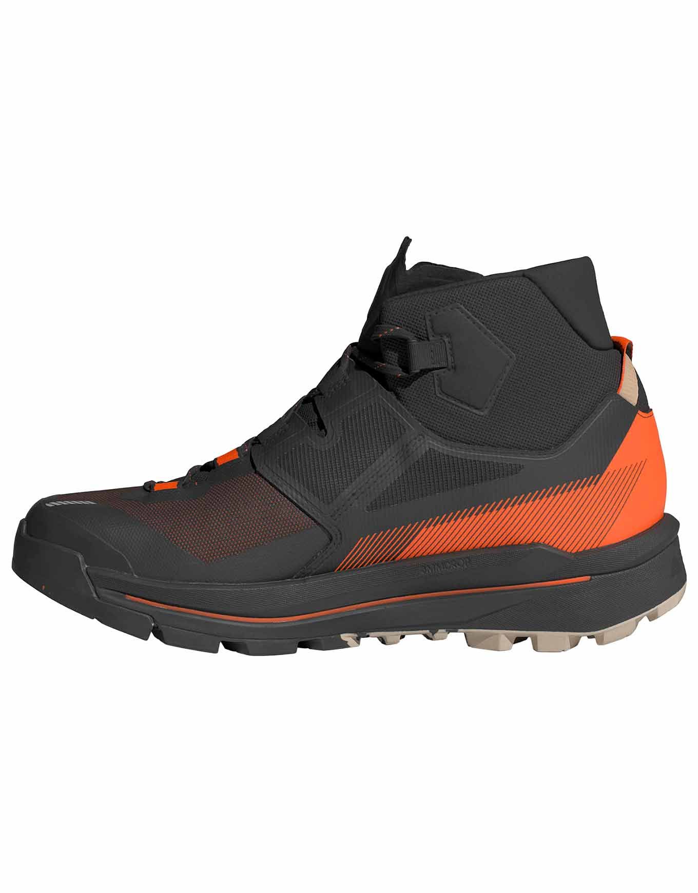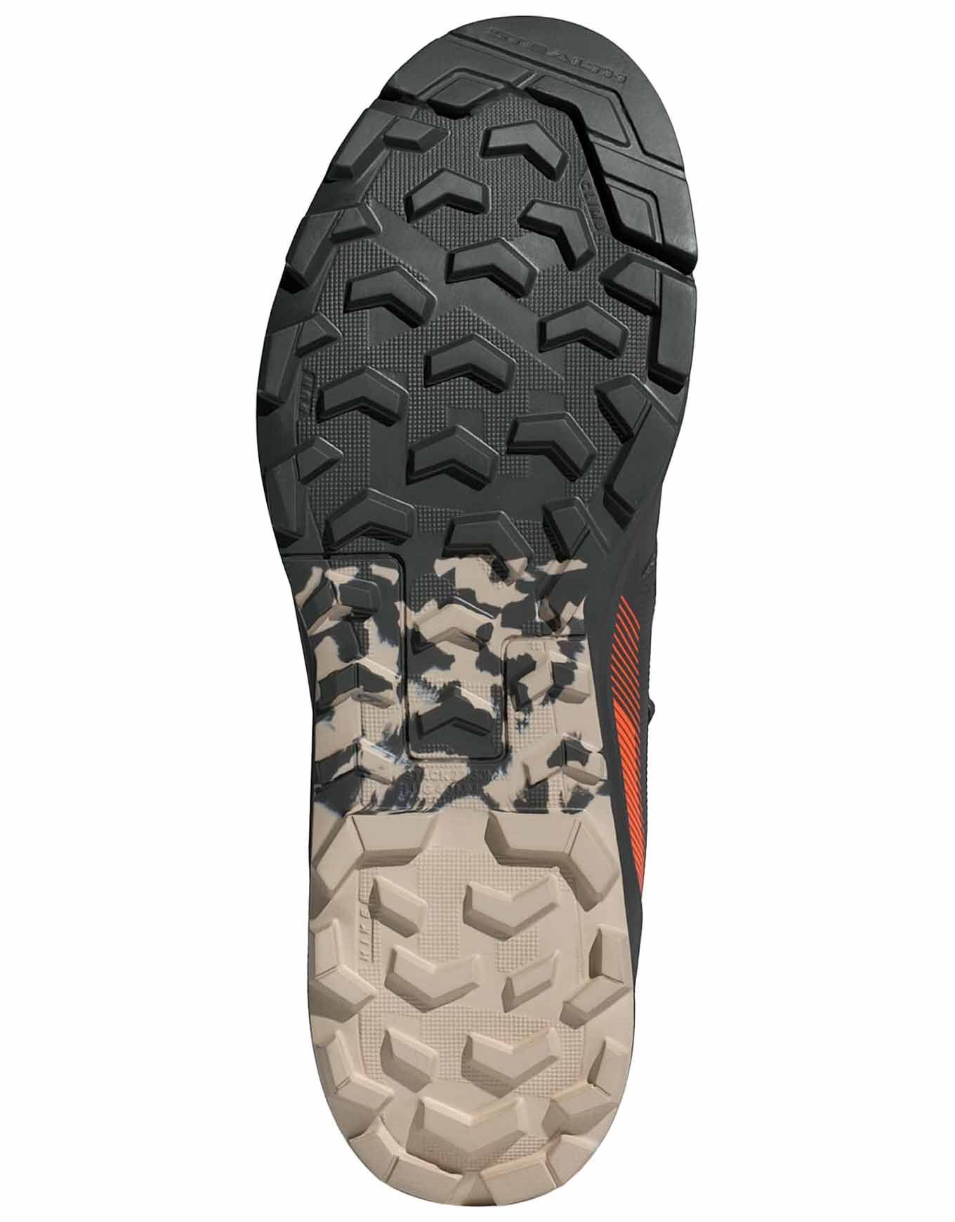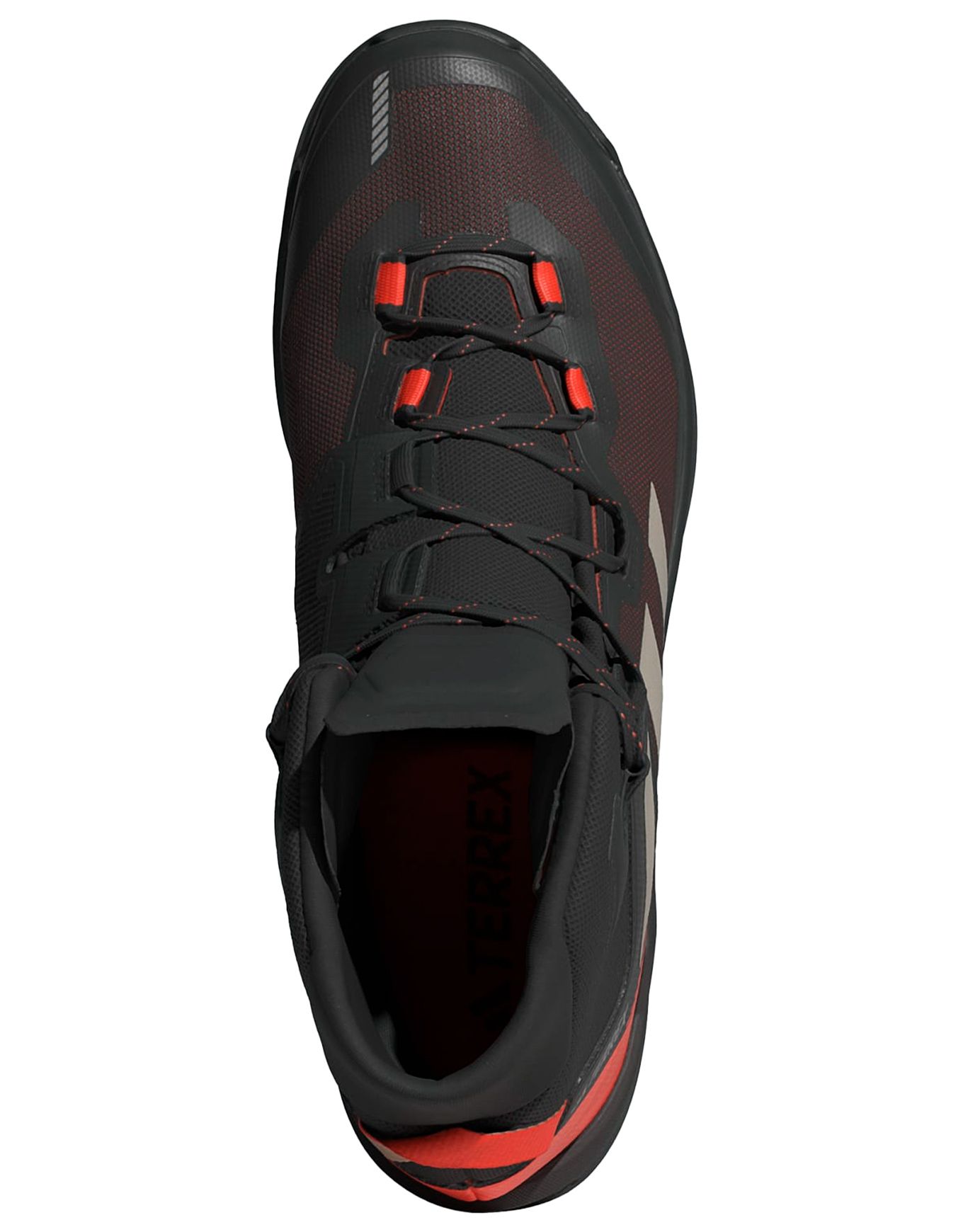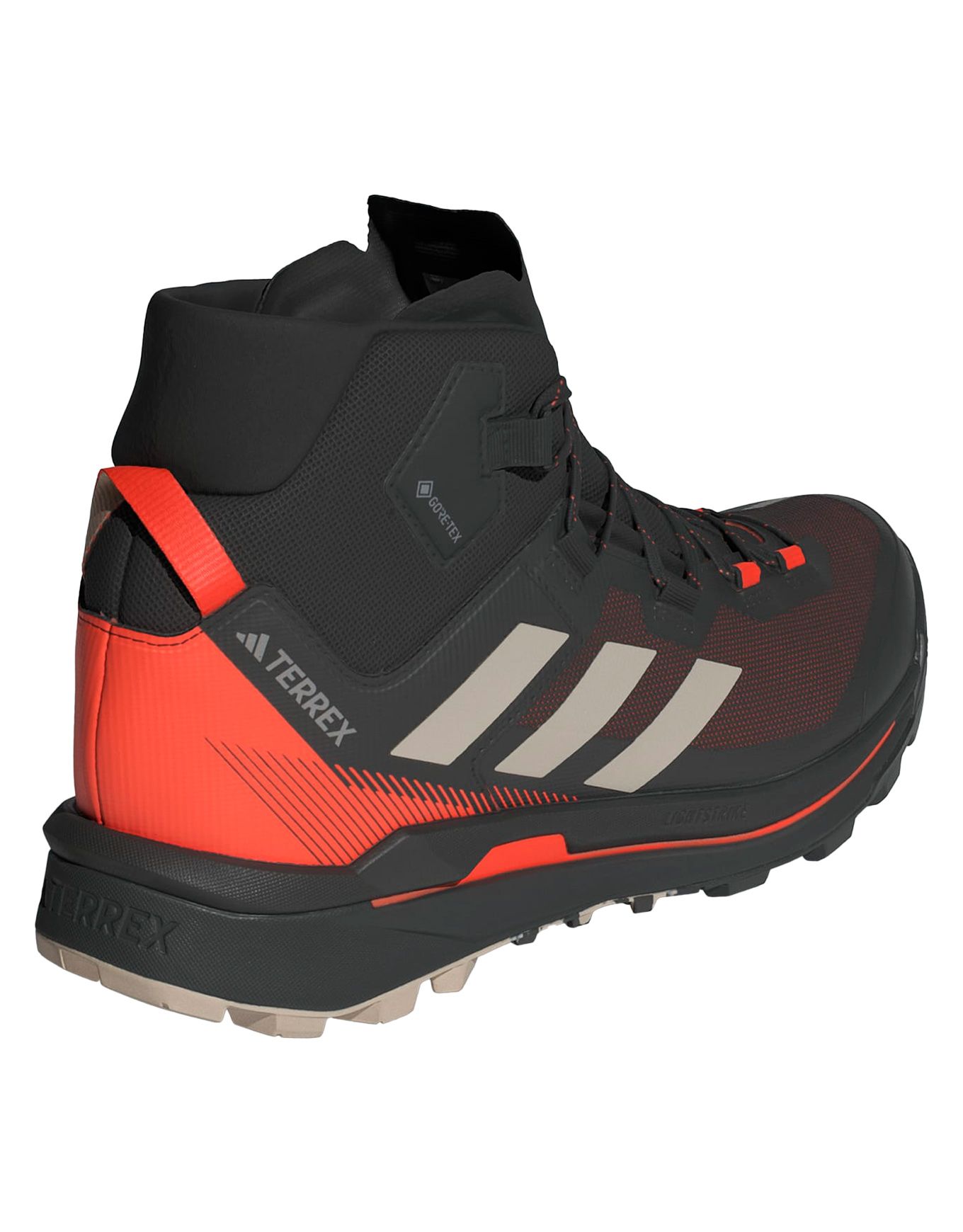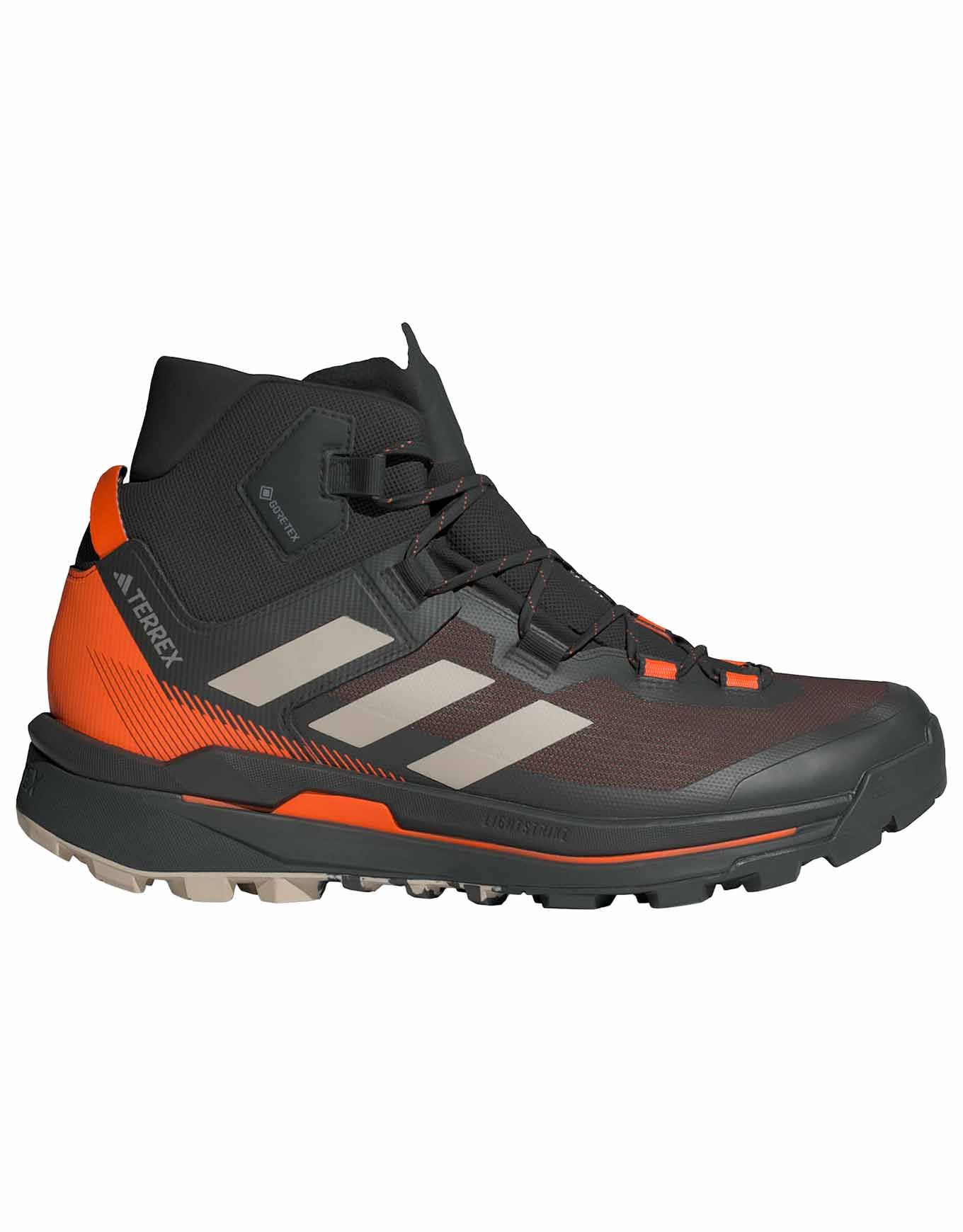 Chaussure Adidas Terrex Skychaser Tech Mid GTX : membrane GORE-TEX imper-respirante, empiècements sans coutures, laçage Asymmetric Arch Support, semelle Lightstrike + plaque Pebax biosourcée et semelle extérieure Stealth HF pour stabilité dynamique sur terrain rocailleux.