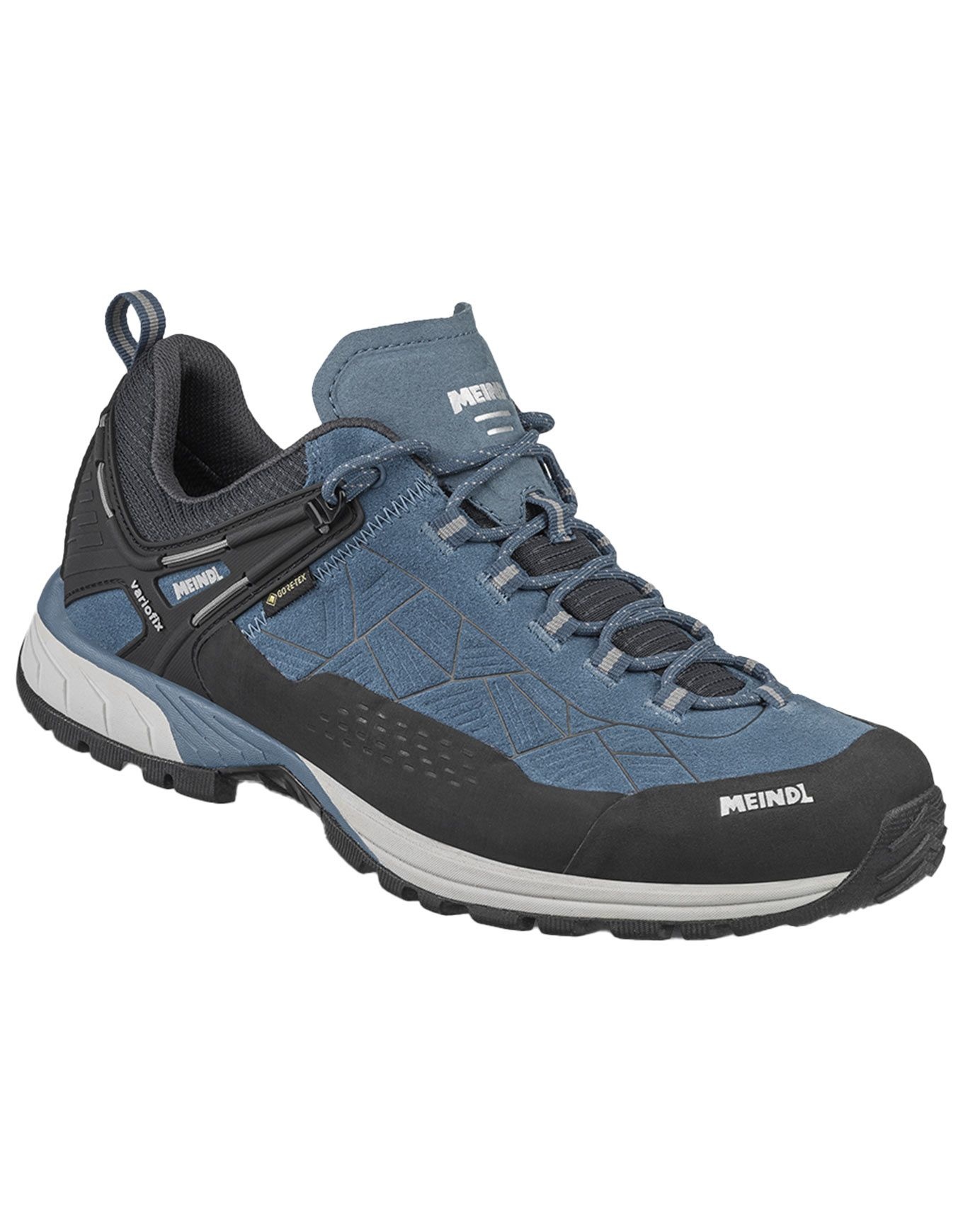 Chaussures Meindl Top Trail GTX Jeans/Grey : cuir suède, mesh et membrane GORE-TEX® pour imperméabilité et respirabilité sur les sentiers. Semelle Multigrip® G5 adhérente, amorti EVA, lacing Variofix® précis.