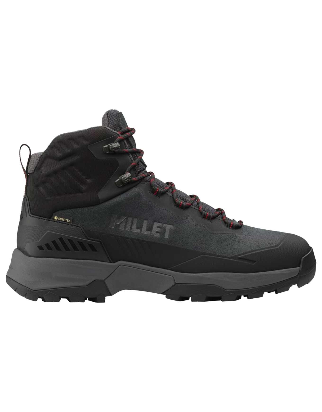 Chaussures de randonnée Millet Ubic Mid GTX Dark Grey en GORE-TEX et cuir suède, semelle VIBRAM TrailTrek XSTREK et intermédiaire EVA pour confort, protection intempéries et accroche fiable.