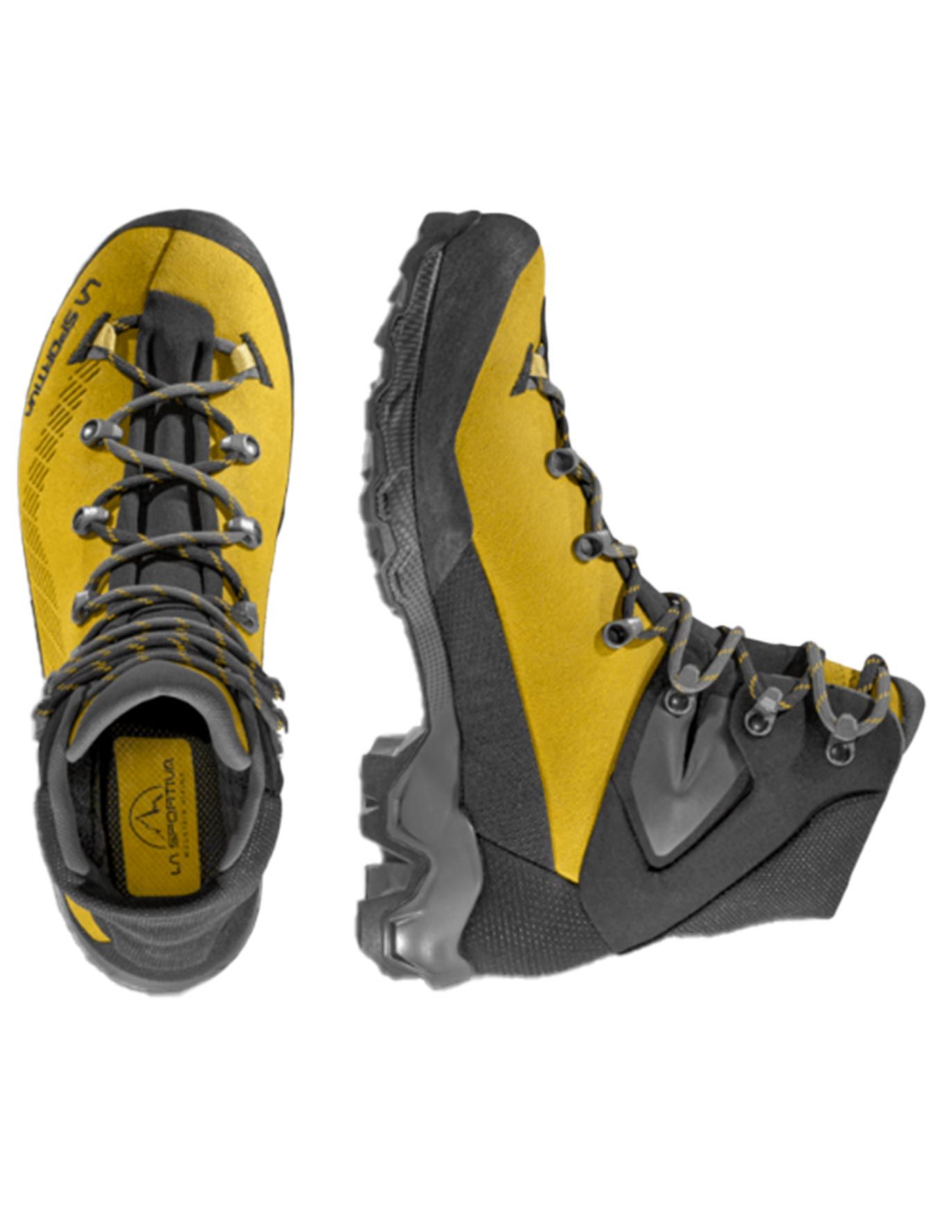 Chaussure de trekking La Sportiva Aequilibrium Trek GTX Savana/Carbon pour homme, combinant membrane GORE-TEX imper-respirante, semelle Vibram antidérapante et système 3D Flex pour une foulée naturelle sur les treks de plusieurs jours.