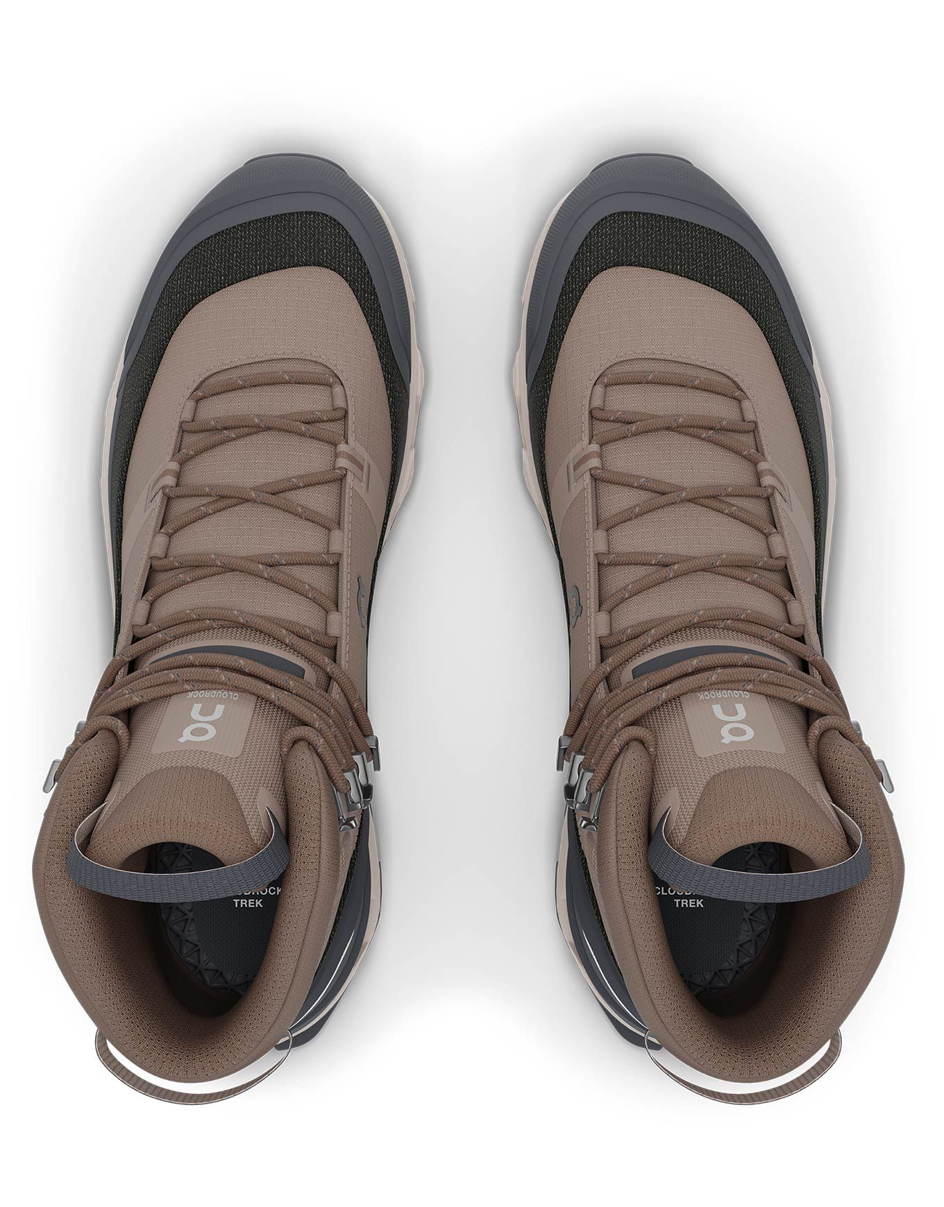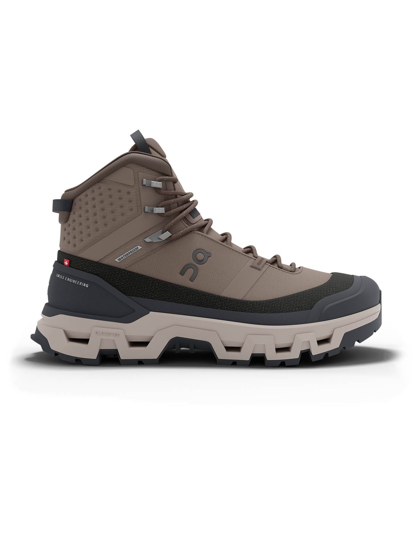 Chaussure de trekking homme On Running Cloudrock Trek WP Ash/Fog, membrane imperméable respirante, semelle Cloudtec® amortie, Missiongrip™ pour traction sèche ou humide, protection pare-pierre et maintien haut.