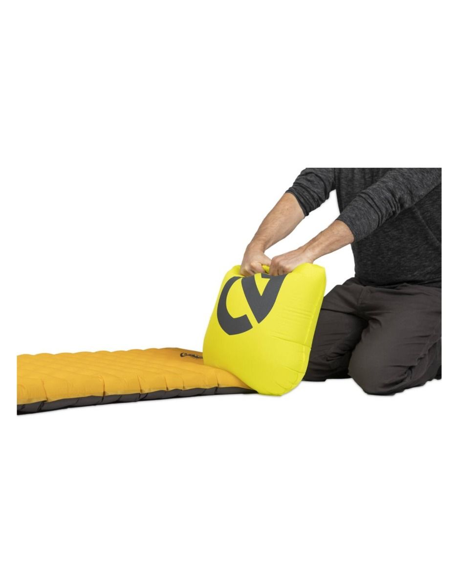 À l’extrémité tête, un coussin gonflable Pillow Baffle™ immobilise l’oreiller et prévient sa dérive. Le gonflage rapide s’effectue à l’aide du sac Vortex™ inclus, évitant ainsi l’introduction d’air humide à l’intérieur. Quelle que soit la position adoptée pour dormir, la valve zéro profil Laylow™ demeure imperceptible sous le dos.