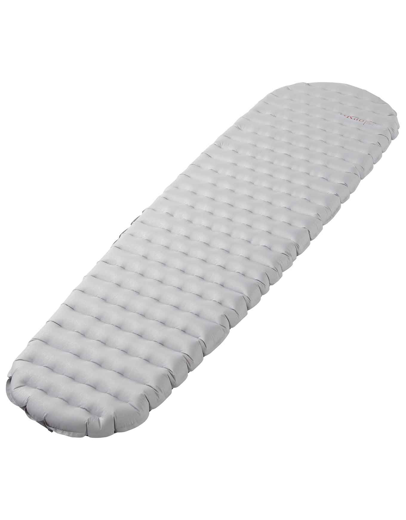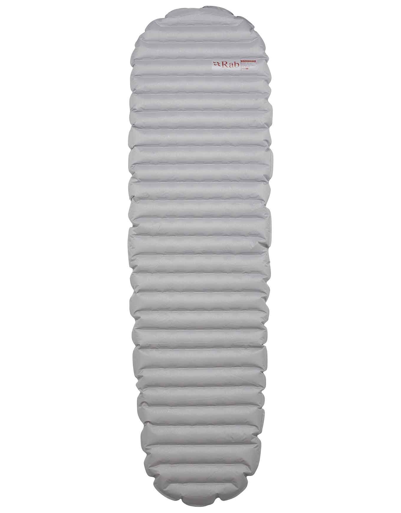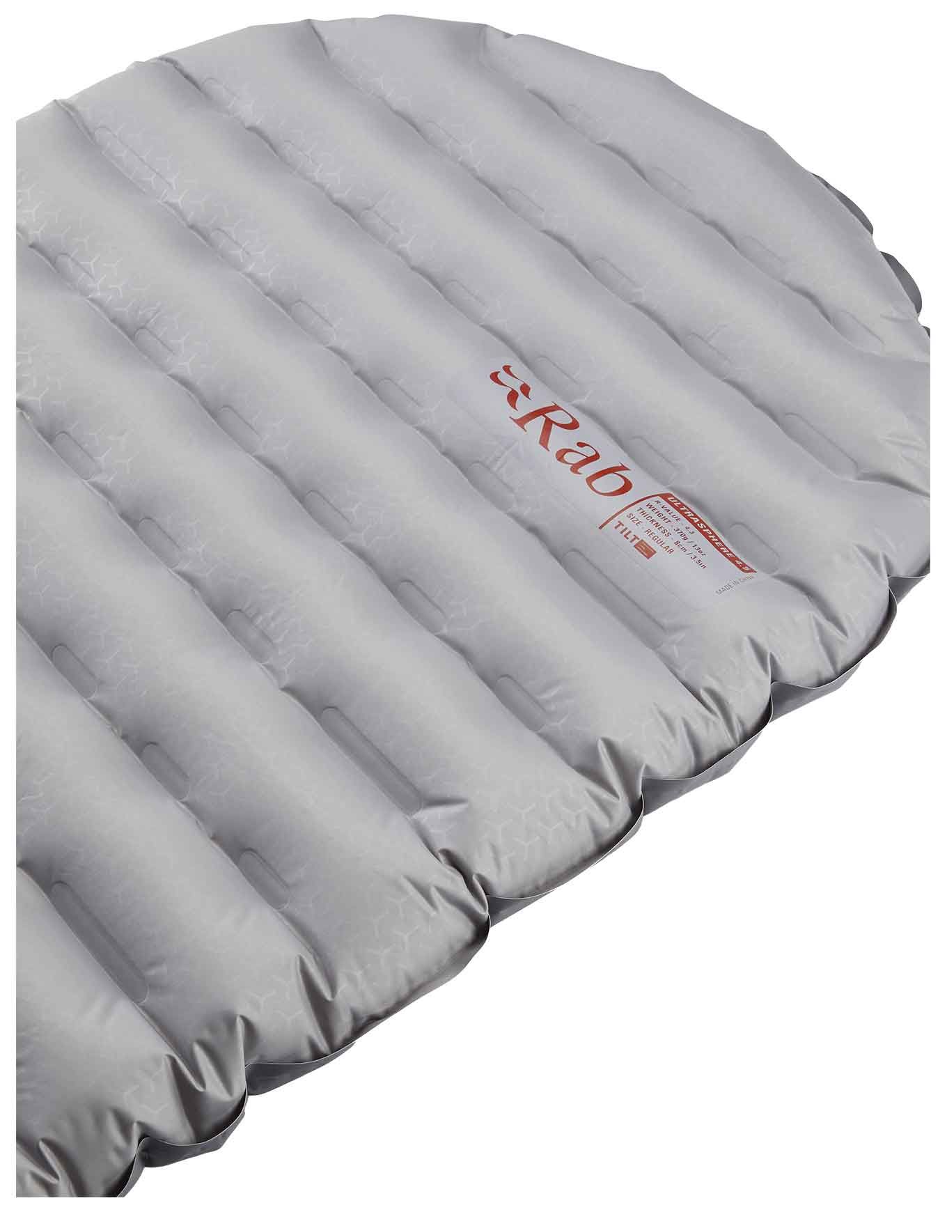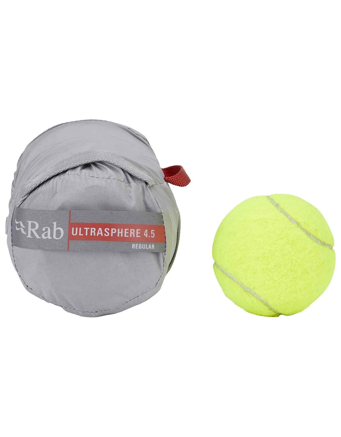 Matelas de bivouac Rab Ultrasphere 4.5 Dark Pewter, ultra-léger et compact, 8 cm d’épaisseur, R-Value 4,3 pour un confort 4 saisons. Compartiments d’air décalés, valve bidirectionnelle, sac de gonflage et kit réparation inclus.