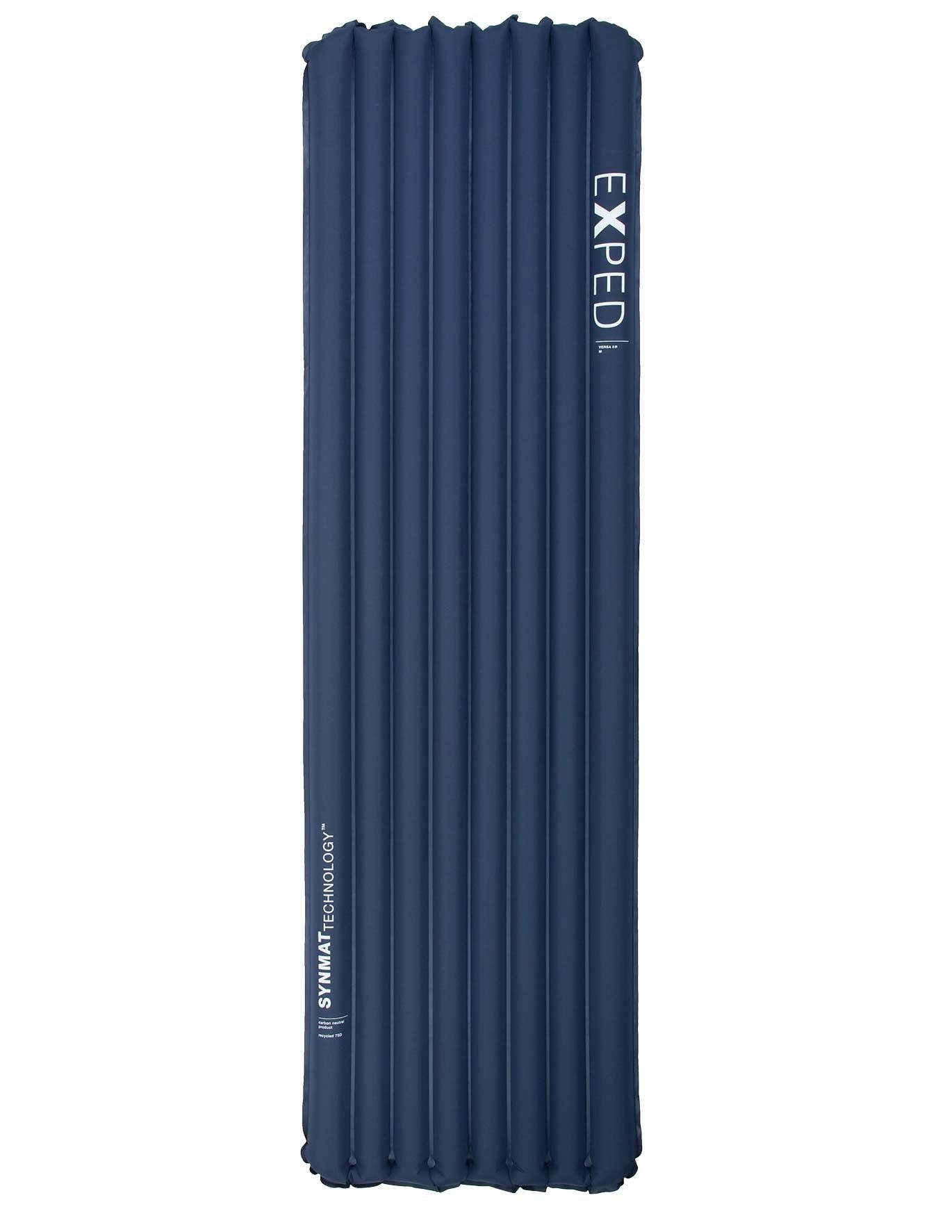 Exped Versa 2R Navy, matelas gonflable 3 saisons ultra-léger et compact en ripstop polyester 75D recyclé, isole jusqu’à 0 °C grâce à la technologie Synmat Technology™ et intègre boudins latéraux pour un soutien stable. Sac de rangement et kit de réparation inclus.