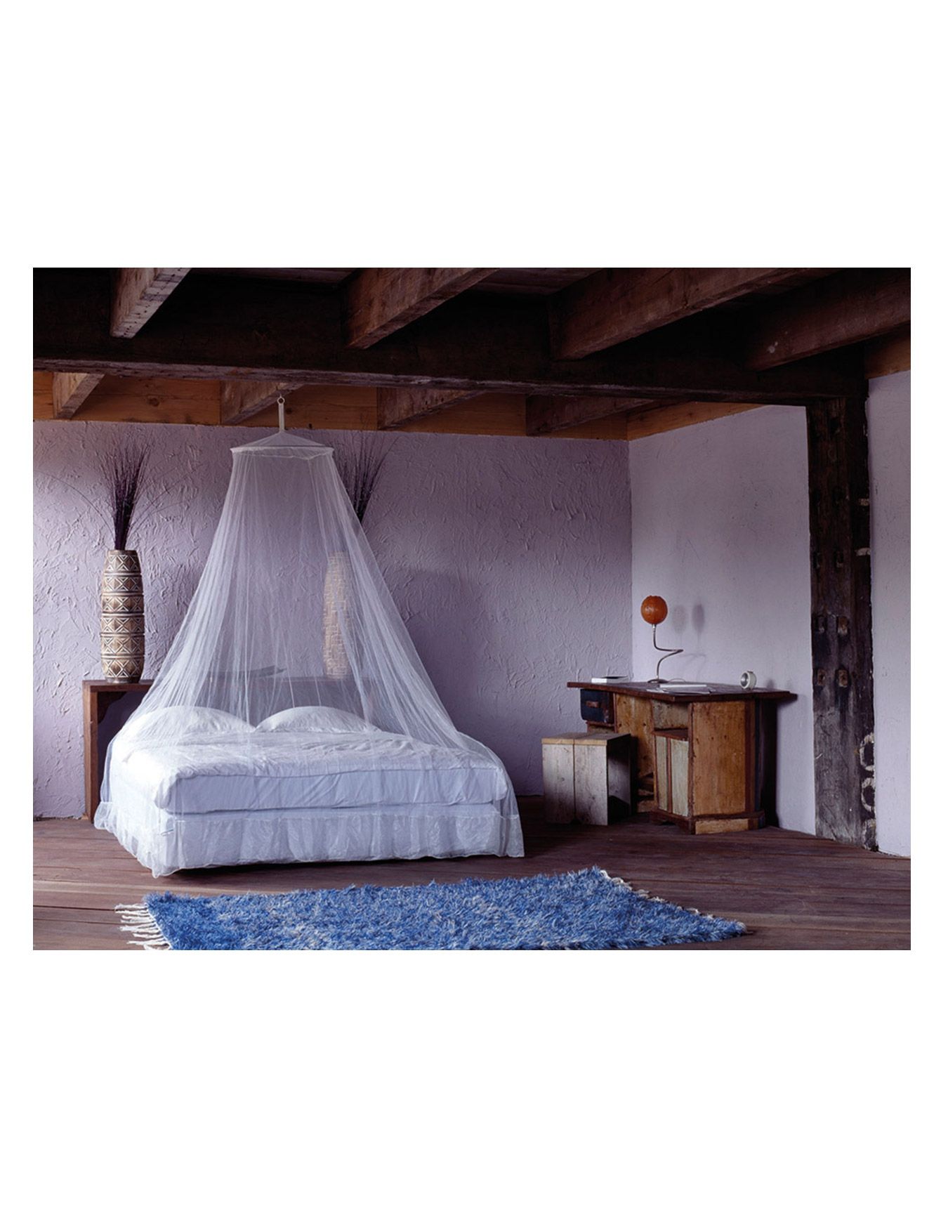Un anneau souple intégré en partie supérieure lui confère sa forme de cloche et assure une stabilité maximale sans nécessiter de structure rigide. L’installation requiert un unique point d’accroche : un crochet fixé au-dessus du couchage ou un fil tendu horizontalement sur lequel suspendre la moustiquaire.