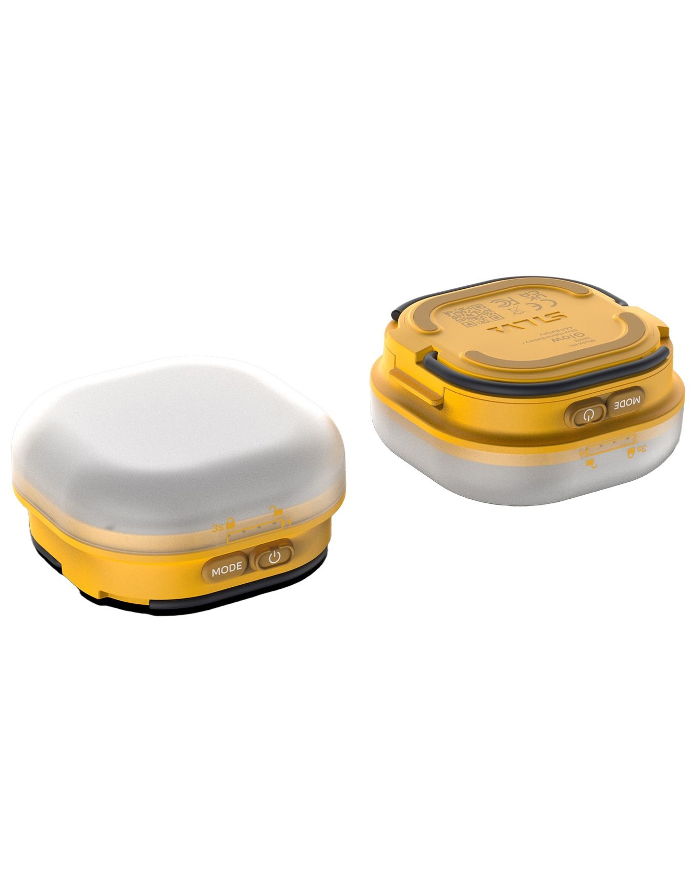 Lanterne Silva Glow Yellow compacte à lumière givrée 360°, blanche ou chaude, 3 niveaux, crochet double, IPX5, piles ou batterie hybride, plastique recyclé.