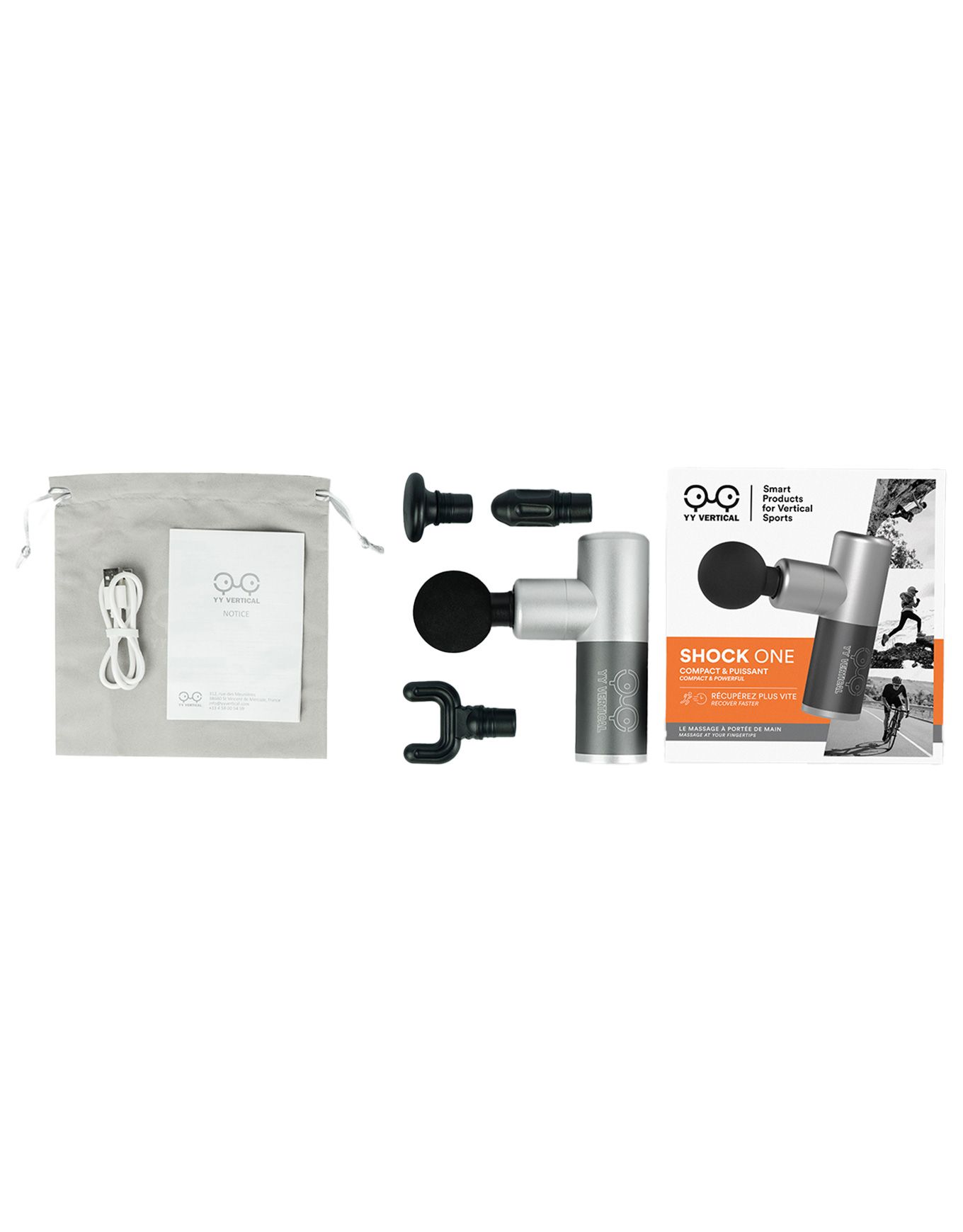 Le Shock One de YY Vertical est un pistolet de massage compact et silencieux, offrant 4 vitesses et 4 têtes interchangeables pour cibler les zones tendues après trail, ski, escalade ou vélo. Autonomie 9 h, structure aluminium aéronautique, niveau sonore < 50 dB.