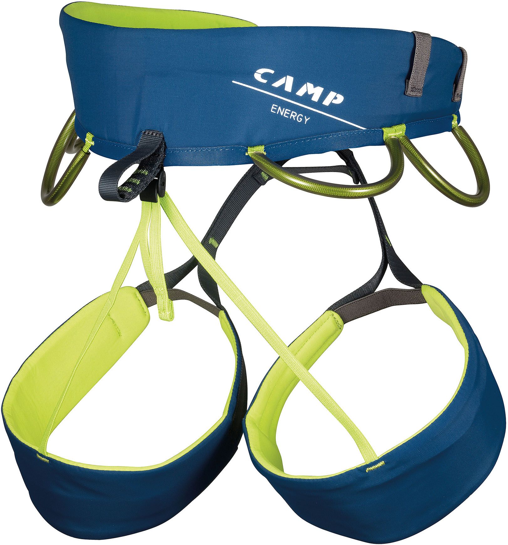 Camp Energy Blue : harnais d’escalade 305 g, thermoformé ceinture et cuisses pour un confort stable, 4 porte-matériel protégés, adapté débutants comme experts.