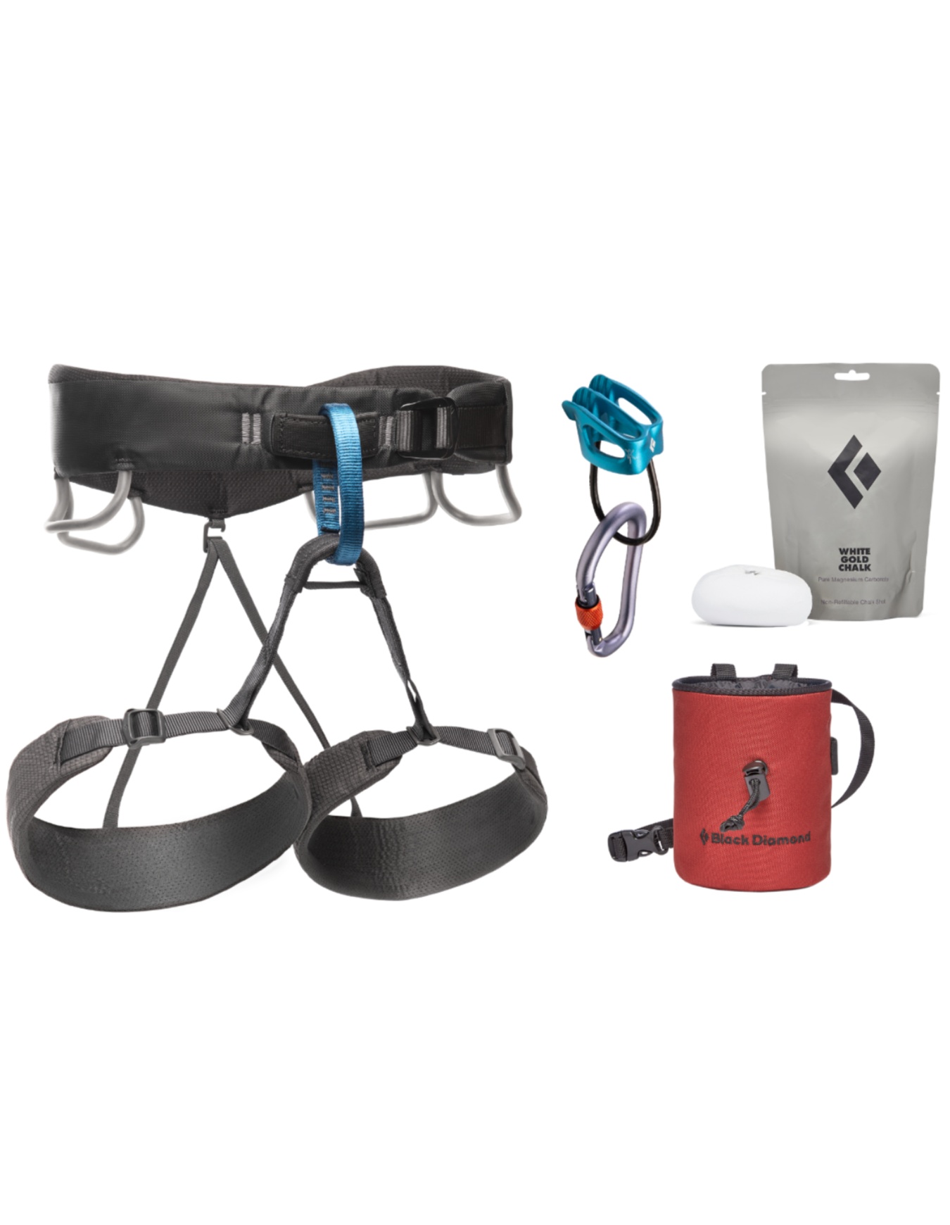 Le Momentum Package Anthracite pour homme de la marque Black DiamondCe pack d’escalade se compose d’un baudrier, d’un dispositif d’assurage, d’un mousqueton et d’un kit sac à magnésie.