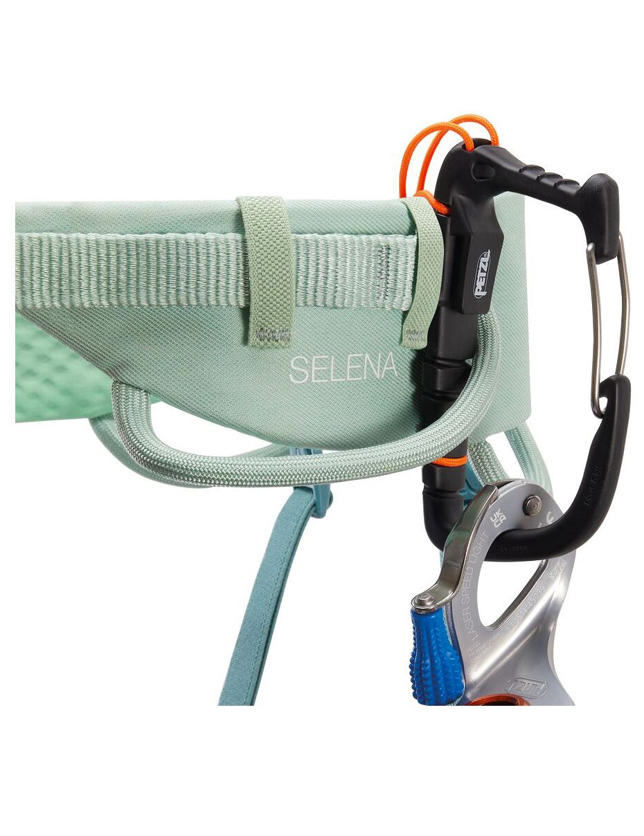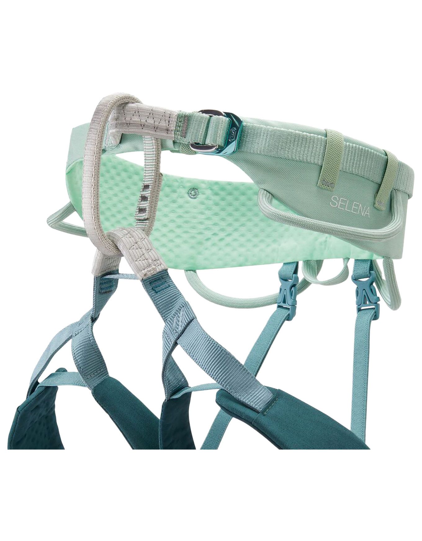 Harnais d’escalade Petzl Selena Jade Green conçu pour la morphologie féminine, offrant maintien confortable, liberté de mouvement et 4 porte-matériel pour salle, falaise et grande voie.