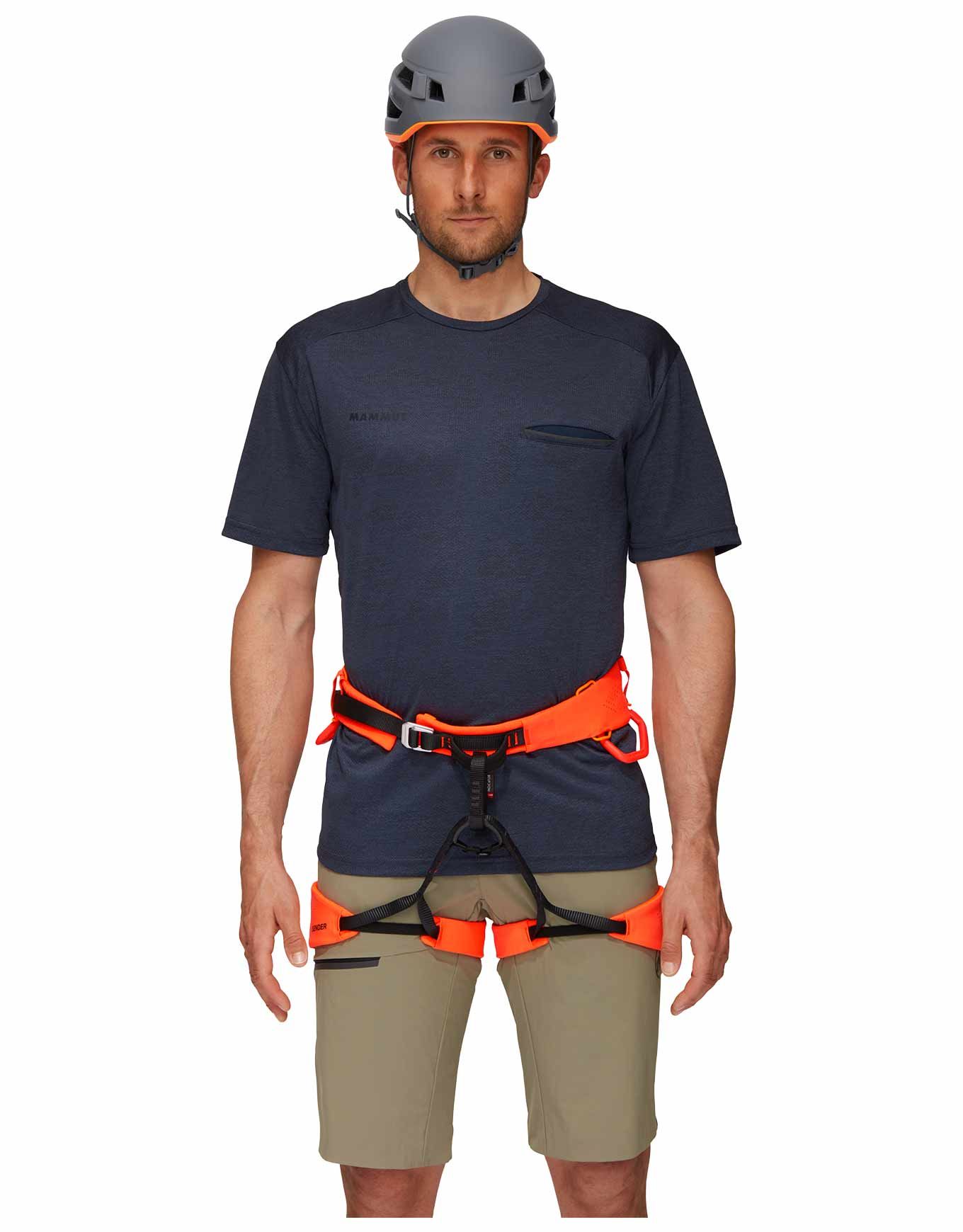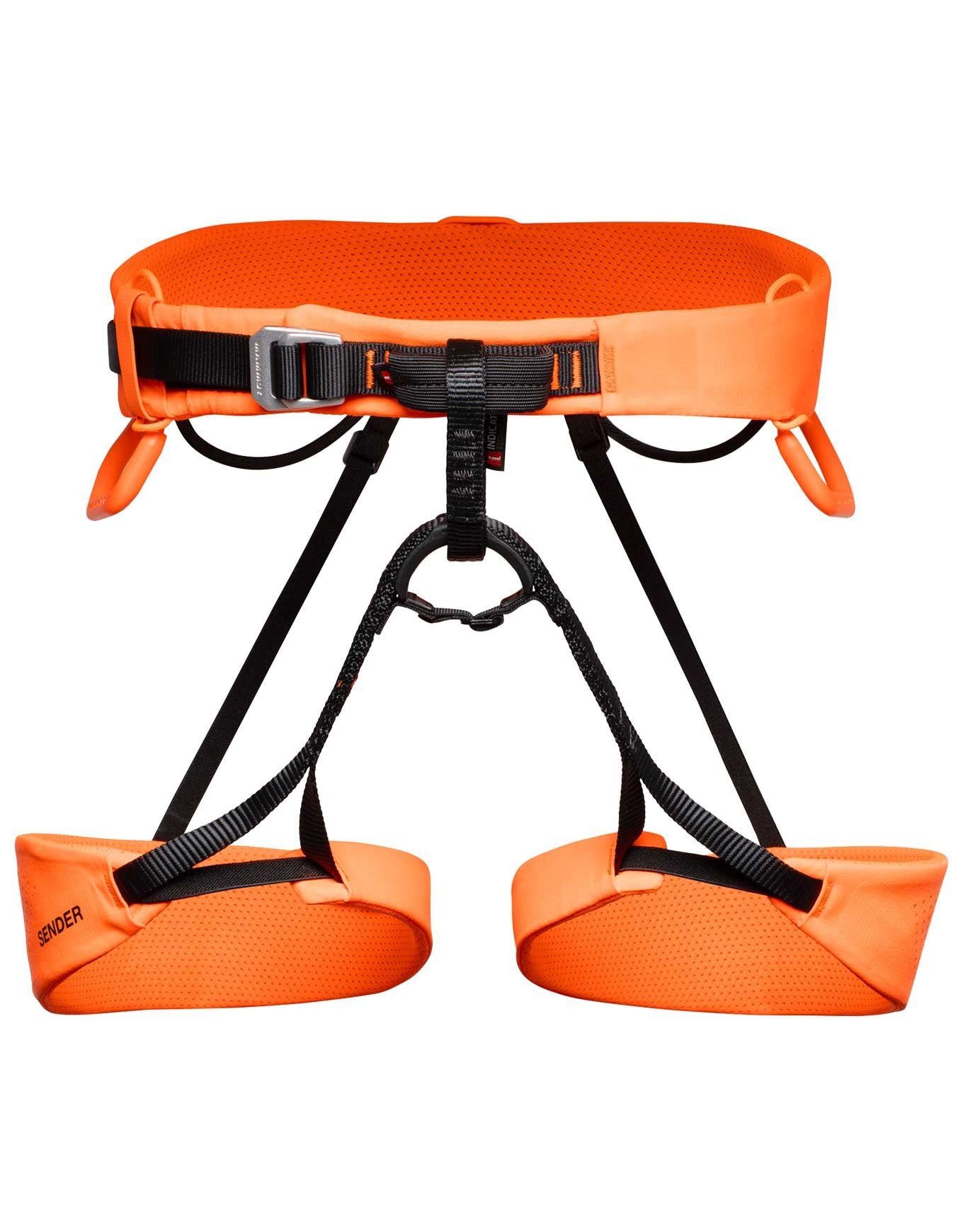 Baudrier d’escalade ultralégère Mammut Sender Harness Black/Safety Orange en matière laserée, respirante et robuste, avec technologie Split Webbing pour répartir les charges. 4 boucles porte-matériel, fixation sac à magnésie et indicateur d’usure intégré.