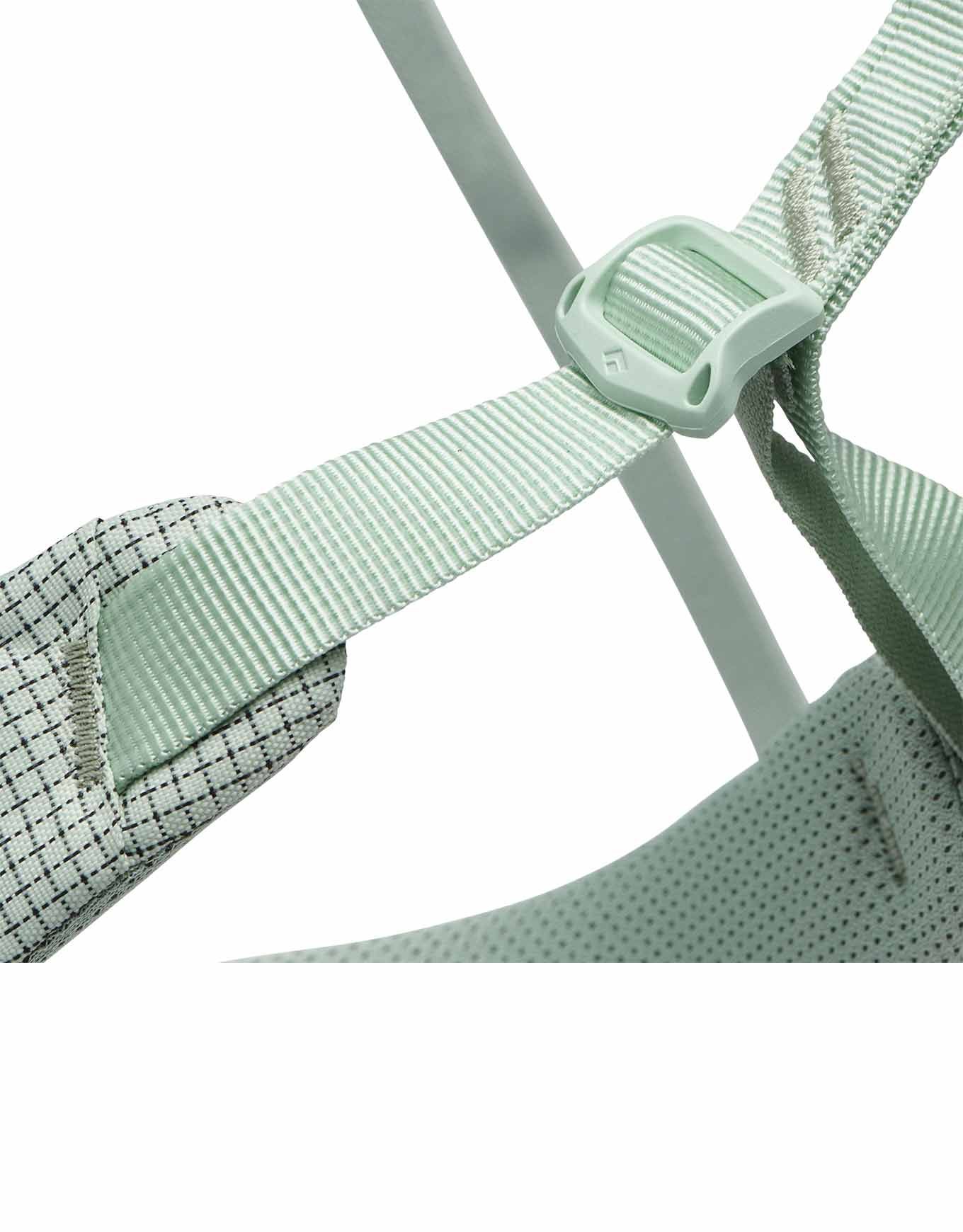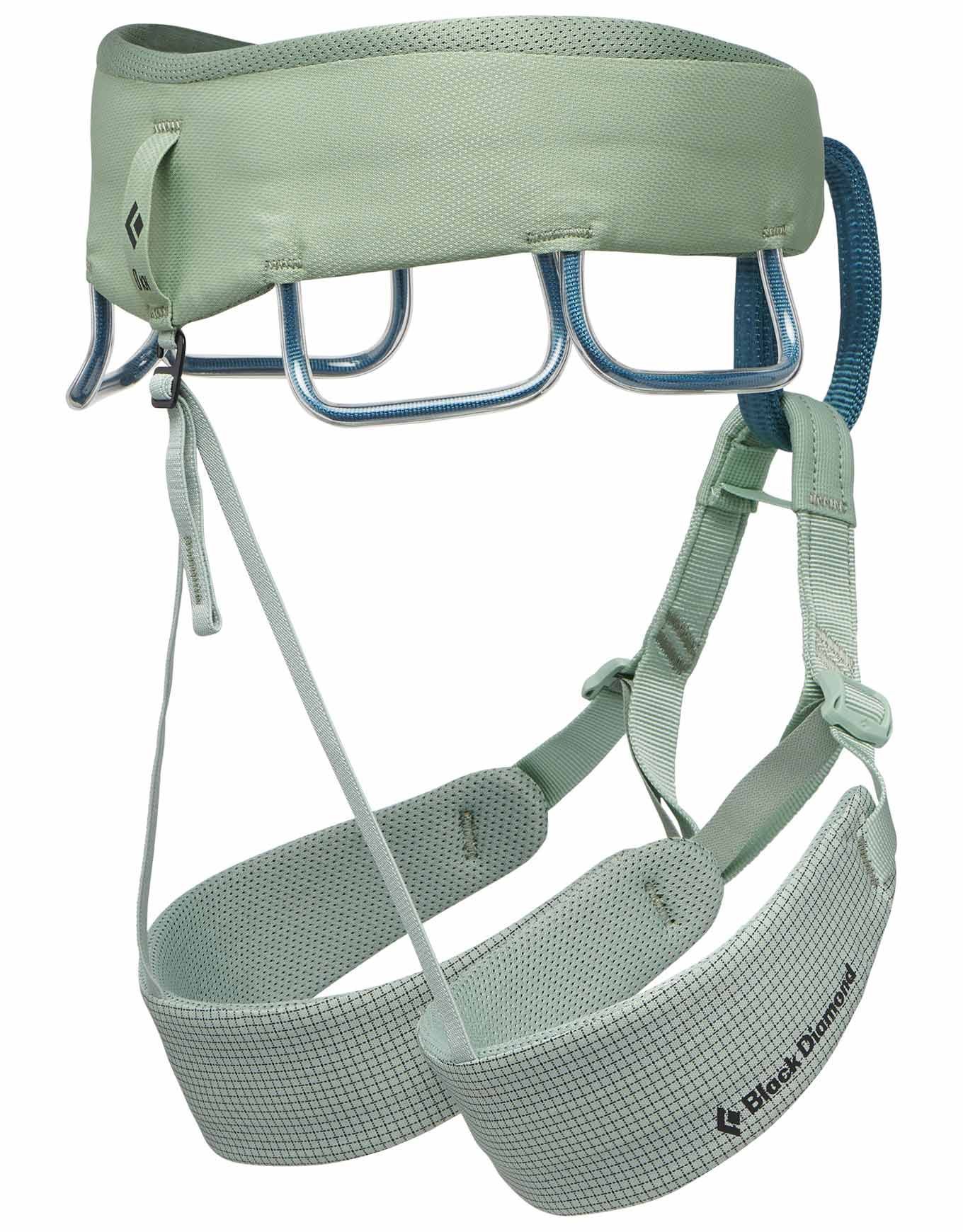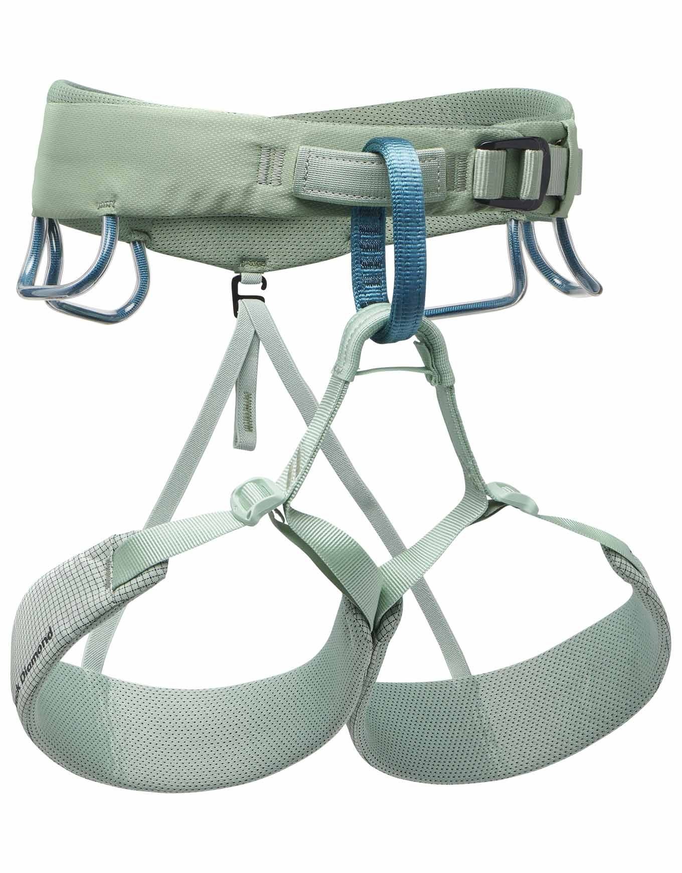Le harnais d’escalade Black Diamond W Momentum Desert Sage pour femme combine la boucle Speed Adjust pour un ajustement rapide, la construction Dual Core Construction™ pour le confort en relais et le système TrakFIT™ adapté aux morphologies féminines.