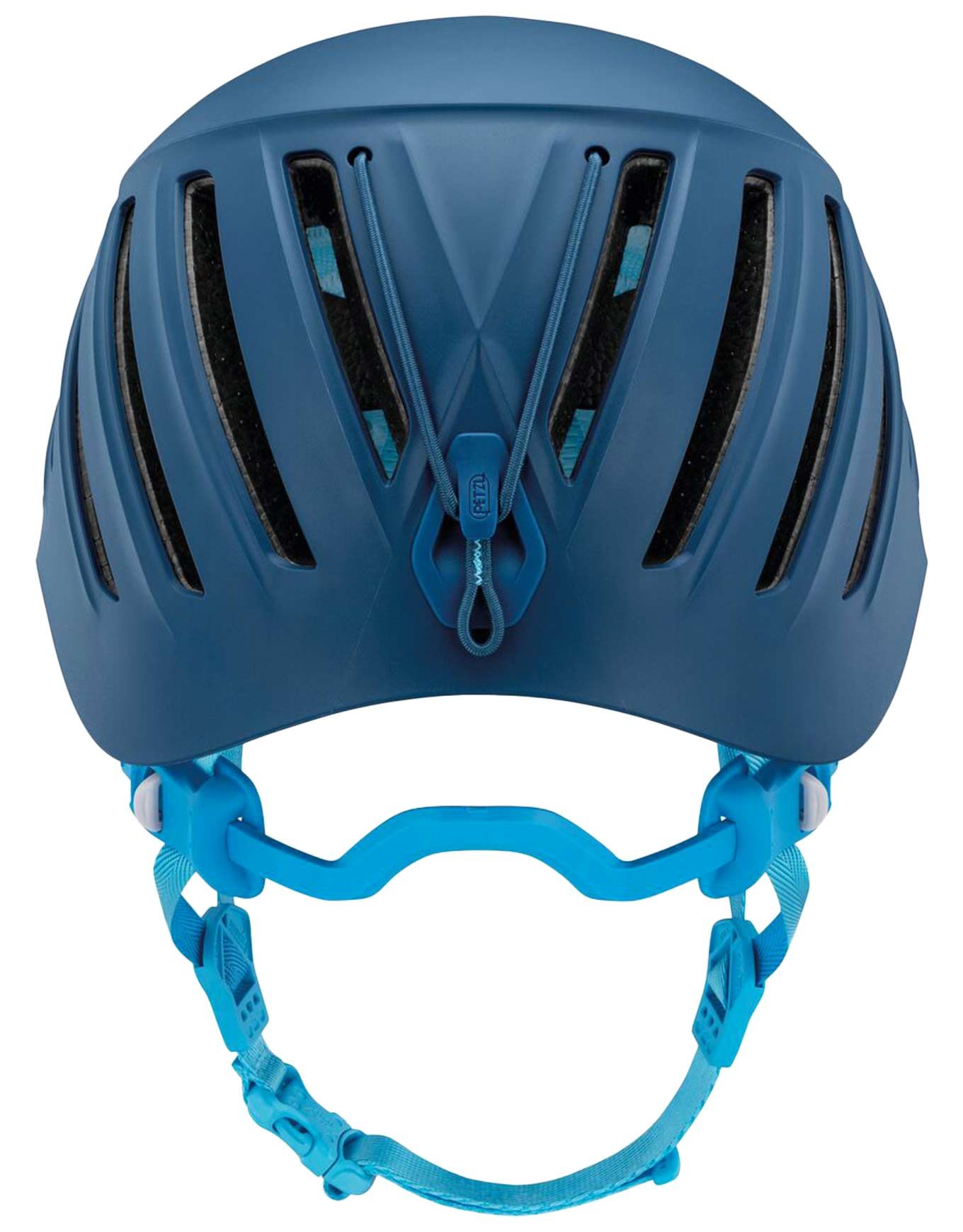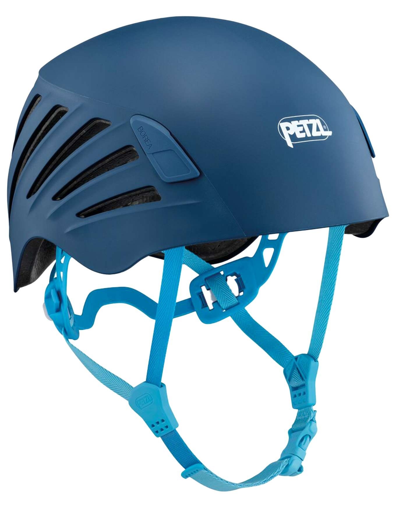 Casque d’alpinisme et d’escalade Petzl Borea Navy Blue spécialement adapté aux femmes, offrant protection renforcée, légèreté et stabilité grâce à sa construction hybride et son système OMEGA pour cheveux longs.
