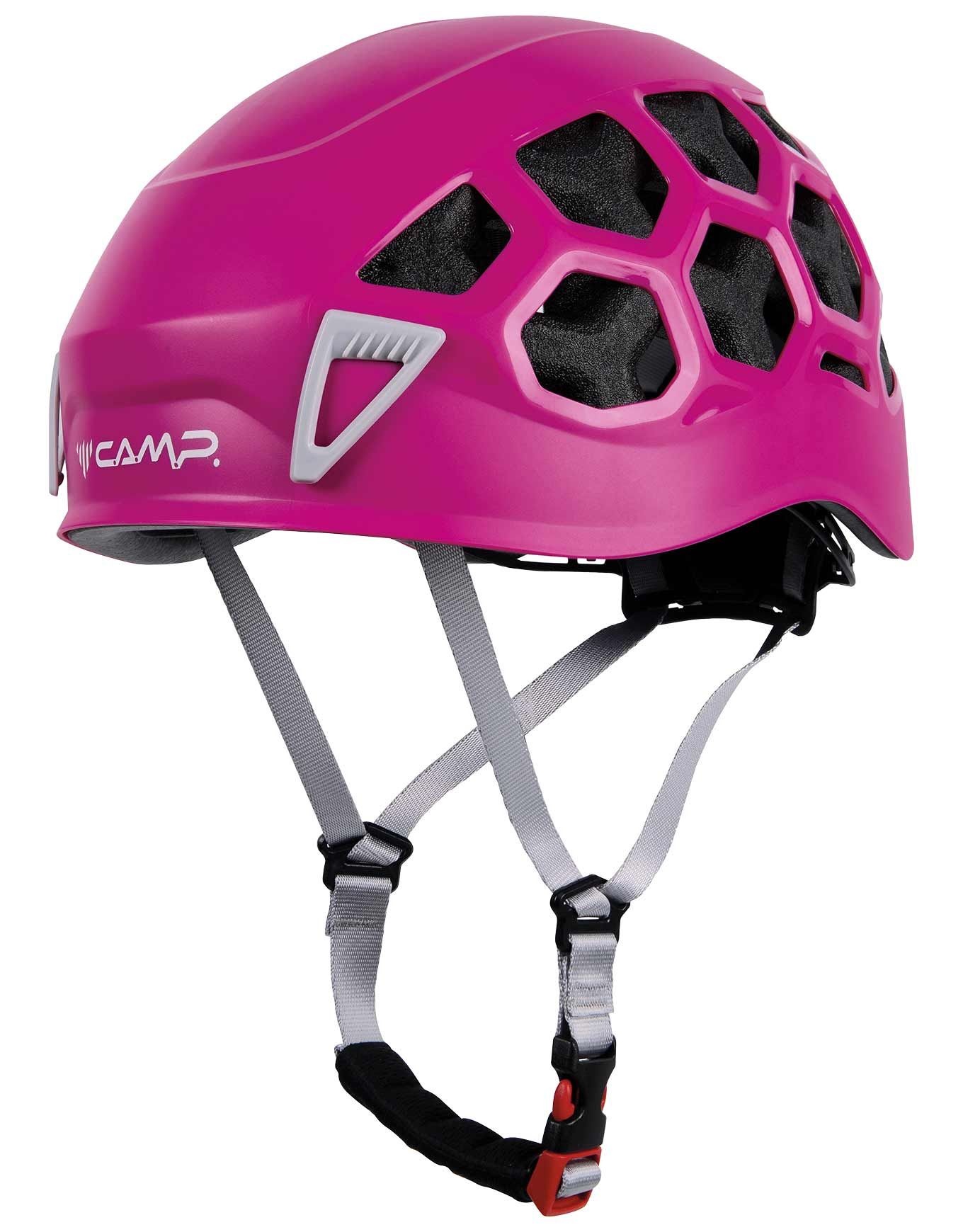 Casque d’escalade Camp Ikon Nova Fuchsia : calotte ABS, coque EPP/EPS, 18 ventilations, réglage molette, support lampe, 345 g.
