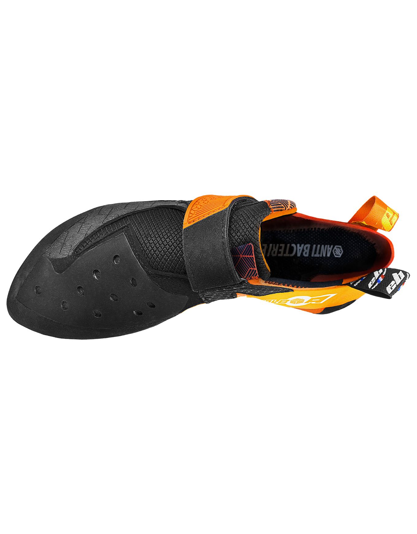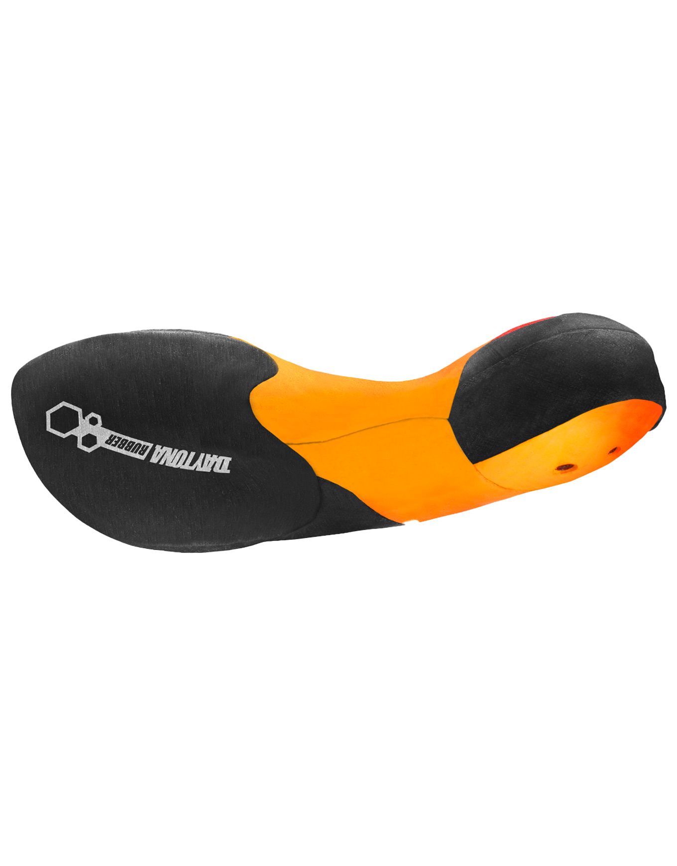 Une gomme Daytona de 4 mm d’épaisseur à la pointe, rigidifiée par un intercalaire, procure précision et sensation directe lors de l’appui. L’intégralité de la puissance du pied est transmise à la prise par un talon enveloppant et souple, alors que l’ajustement rapide et précis est garanti par un serrage mono-volcro.