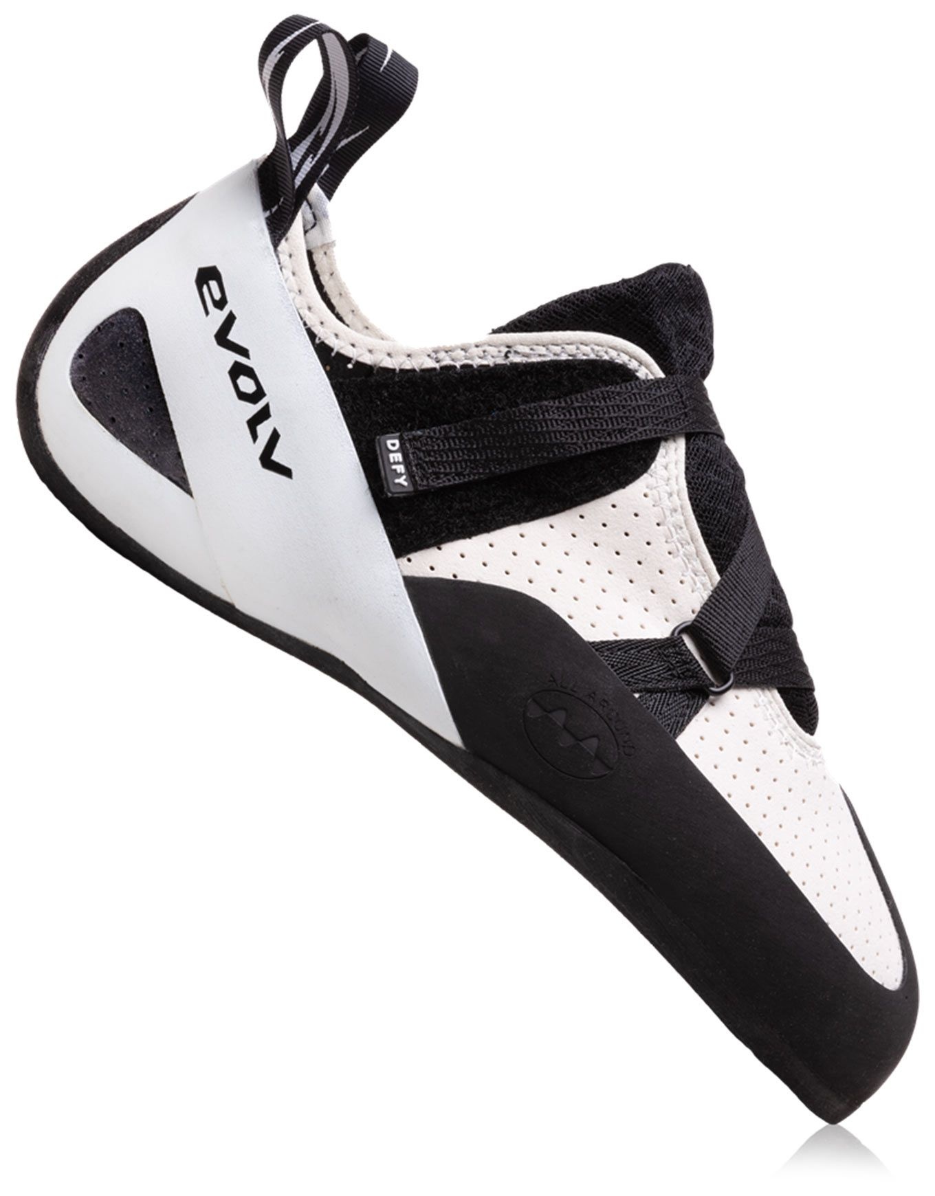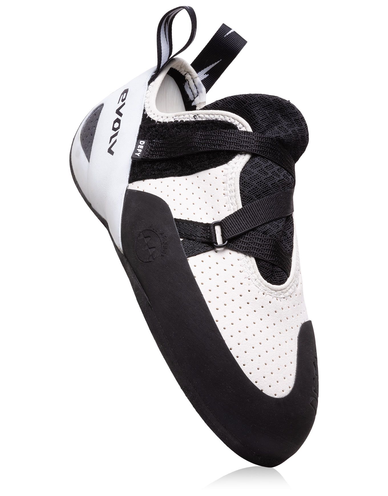 Chausson d’escalade Evolv Defy Gray/Black unisexe, idéal débutants : mise rapide, tige perforée respirante, construction asymétrique à faible cambrure pour précision et confort.
