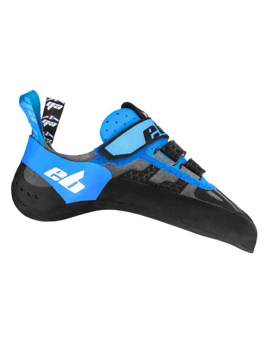 Chausson d’escalade EB Django homme, polyvalent loisir ou performance, offre un confort immédiat en microfibre Hightech, asymétrie marquée et pointe griffée pour précision sur petites prises.