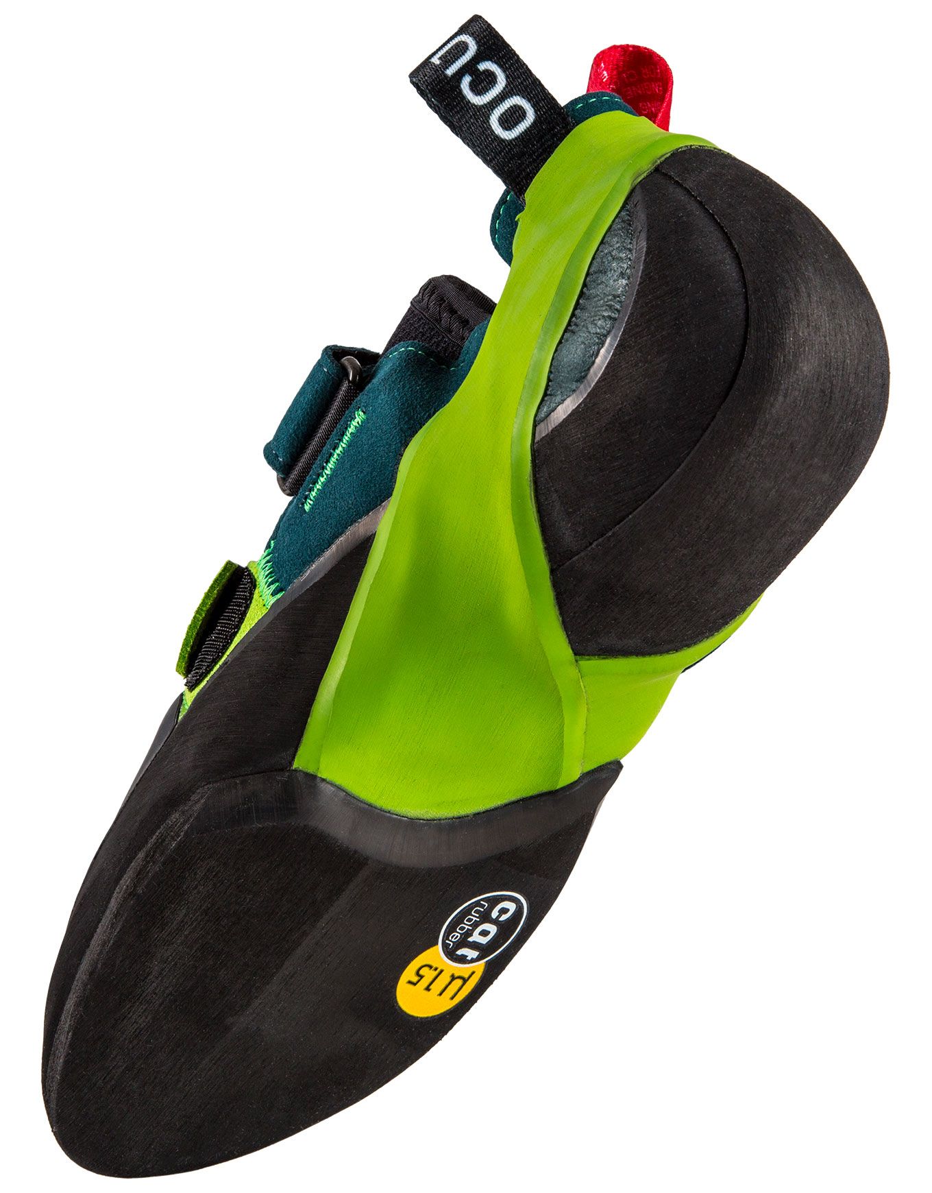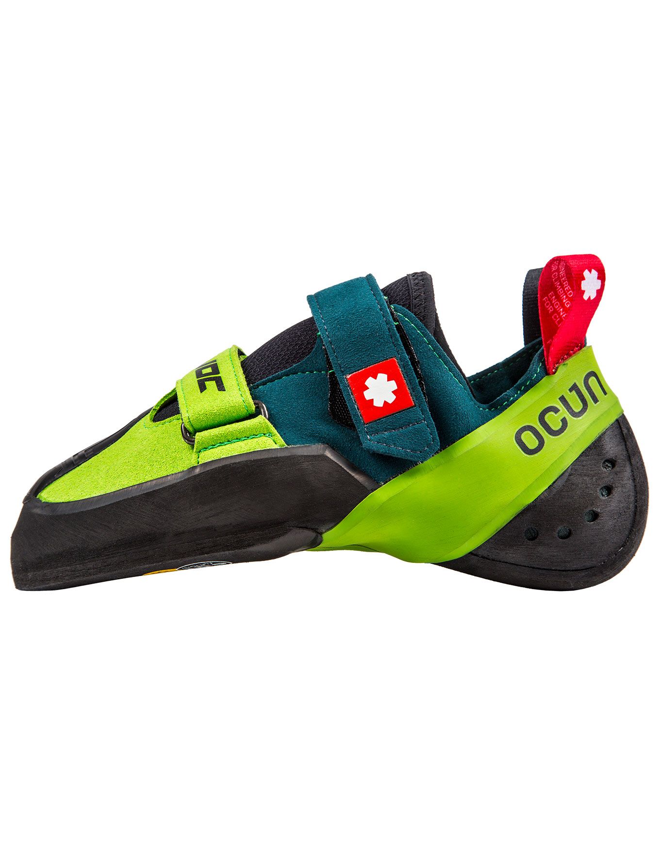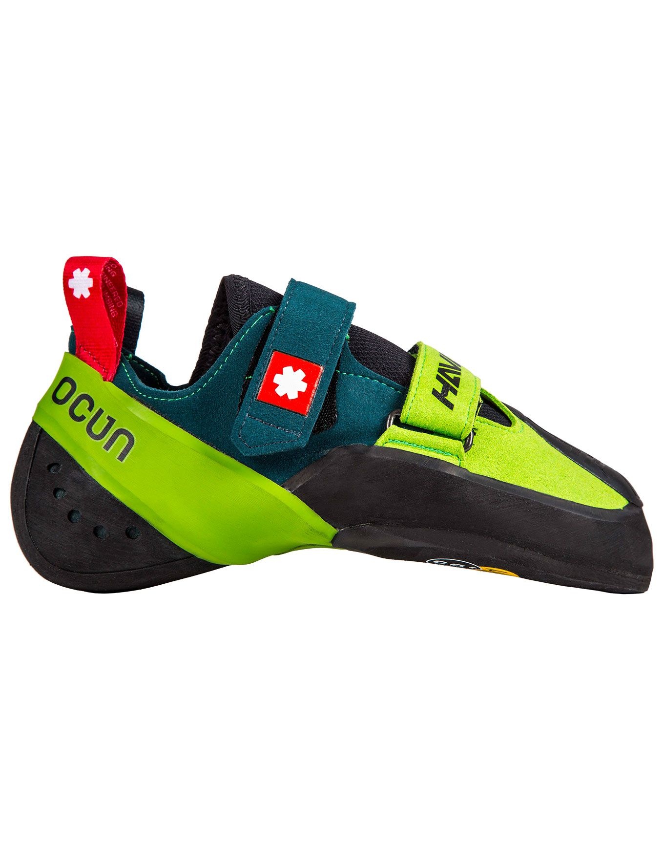 Le chausson d’escalade Ocun Havoc Petrol/Green allie profil polyvalent et asymétrie modérée pour grimpeurs pieds égyptiens moyens à étroits, patch 3D gomme pour crochetages précis, tige microfibre 100 % végan, semelle intermédiaire 2D Toe Soft et adhérence fiable en bloc ou falaise.