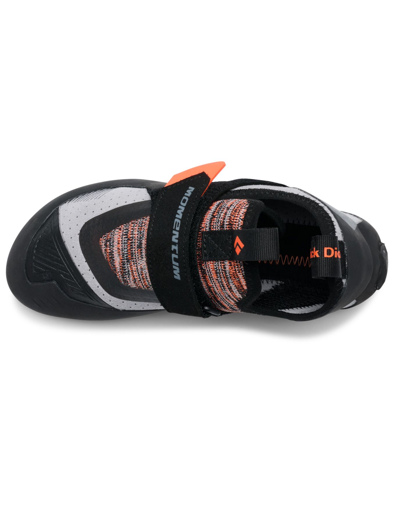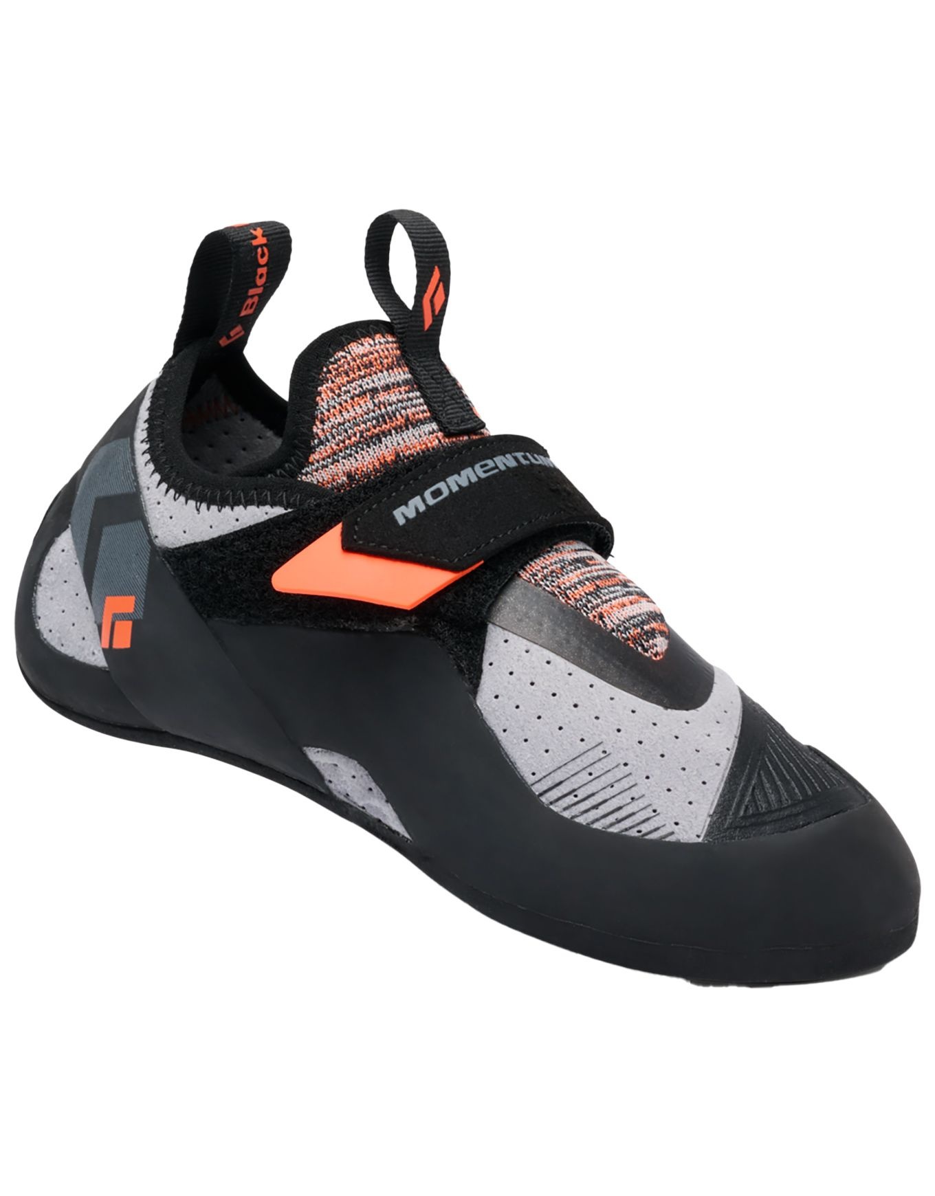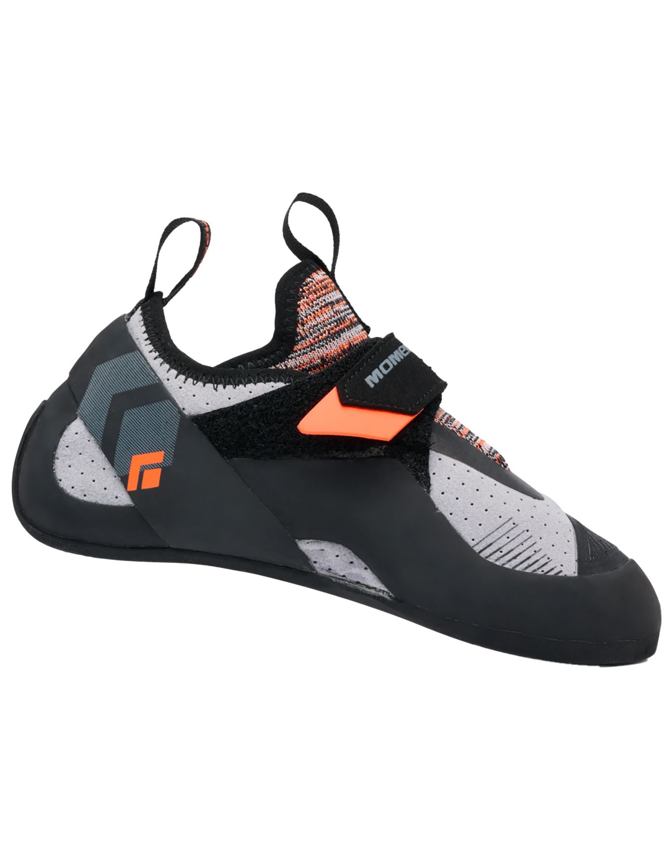 Chausson d’escalade Black Diamond J Momentum Pewter conçu pour les 7-12 ans, avec semelle Black Label adhérente, tige microsuède extensible et double velcro pour ajustement précis.