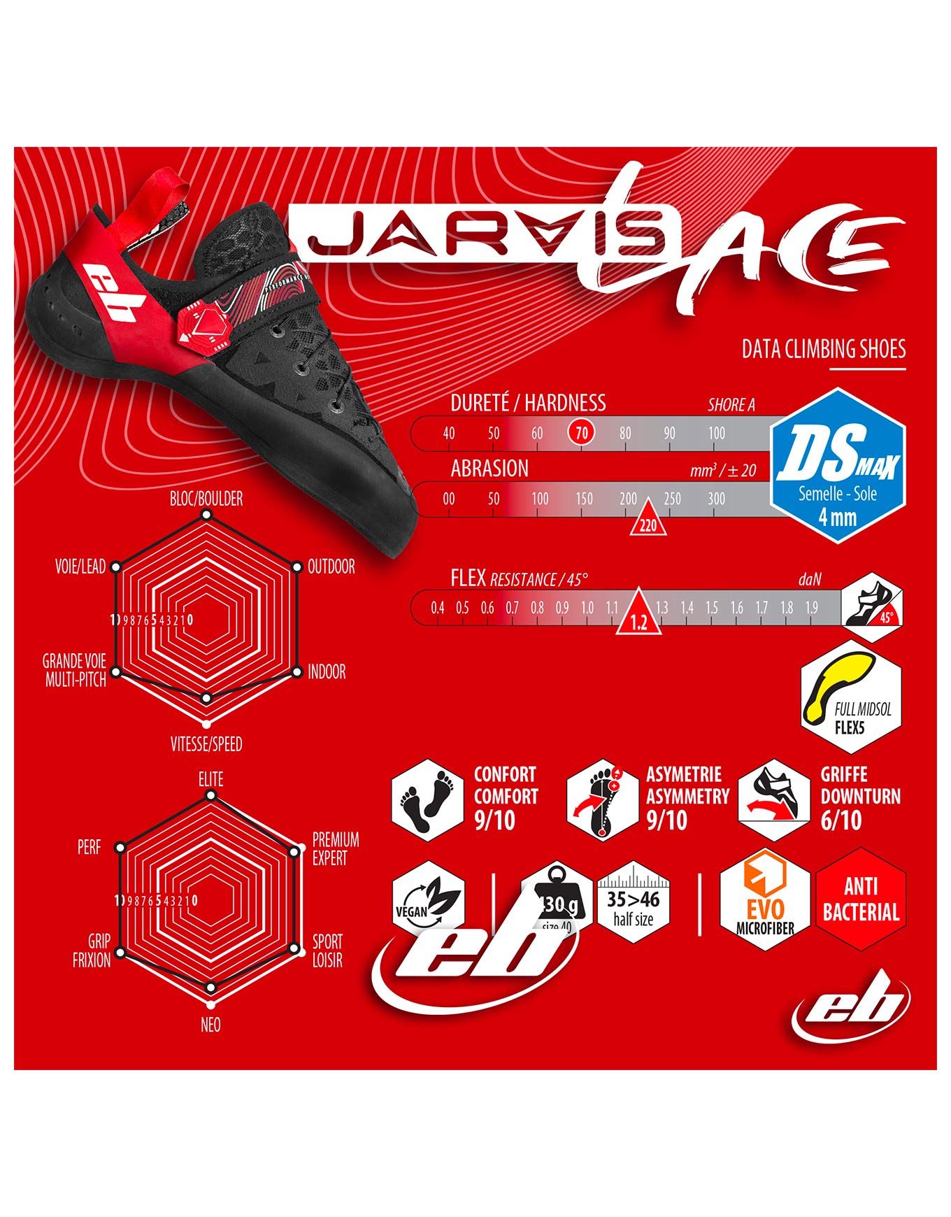 Chausson d’escalade EB Jarvis Lace, laçage innovant pour ajustement micrométrique, tige Evo microfiber, semelle DS Max 4 mm, précision et adhérence sur réglettes fines.