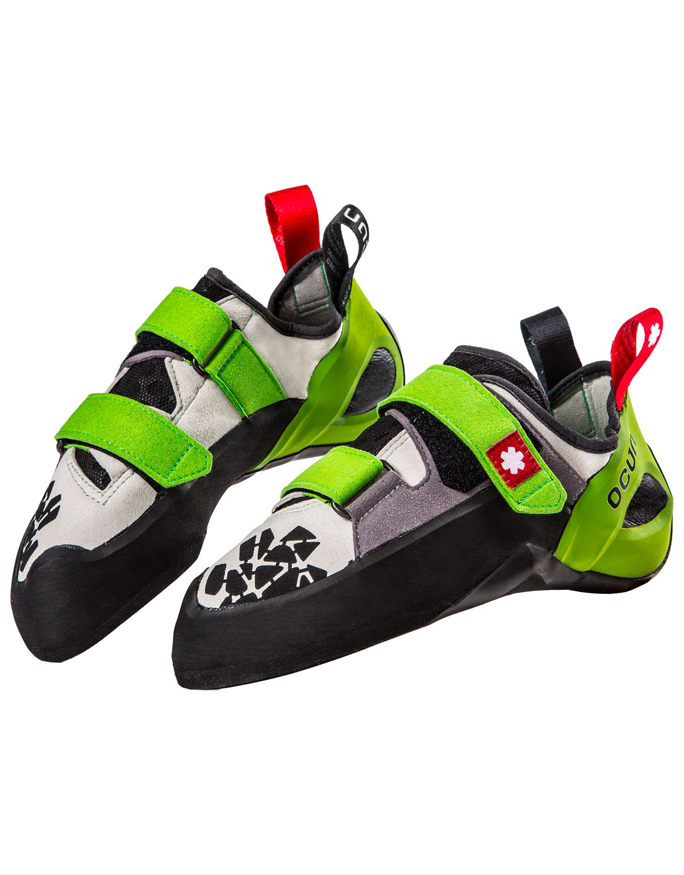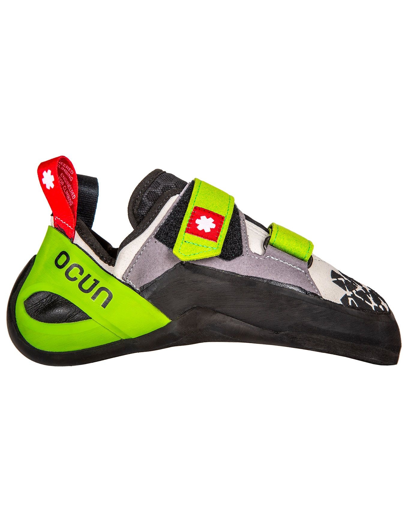 Chausson d’escalade Ocun Jett QC Grey/Green conçu pour la voie et la grande voie, profil All-Round à asymétrie modérée pour pieds égyptiens, microfibres 100 % véganes, volume généreux au cou-de-pied et à la pointe, semelle intermédiaire 2D Fit Hard rigide et gomme ultra-adhérente.