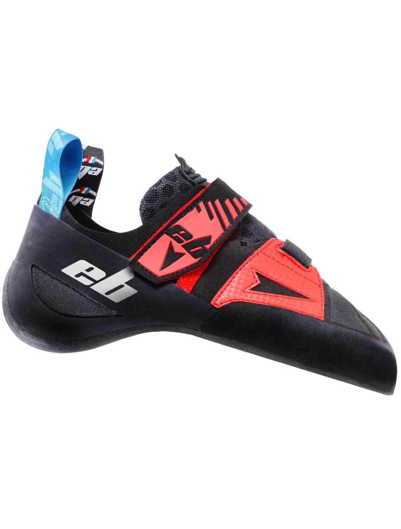 Chaussons d’escalade EB Red, haut de gamme pour experts, combinant puissance et confort grâce à la microfibre EVO Microfiber et la semelle Daytona 5 mm pour précision et adhérence en salle ou en falaise.