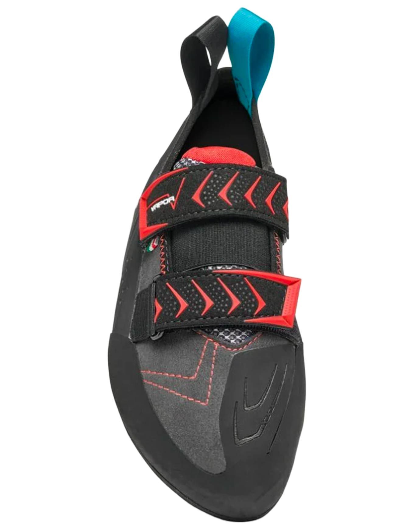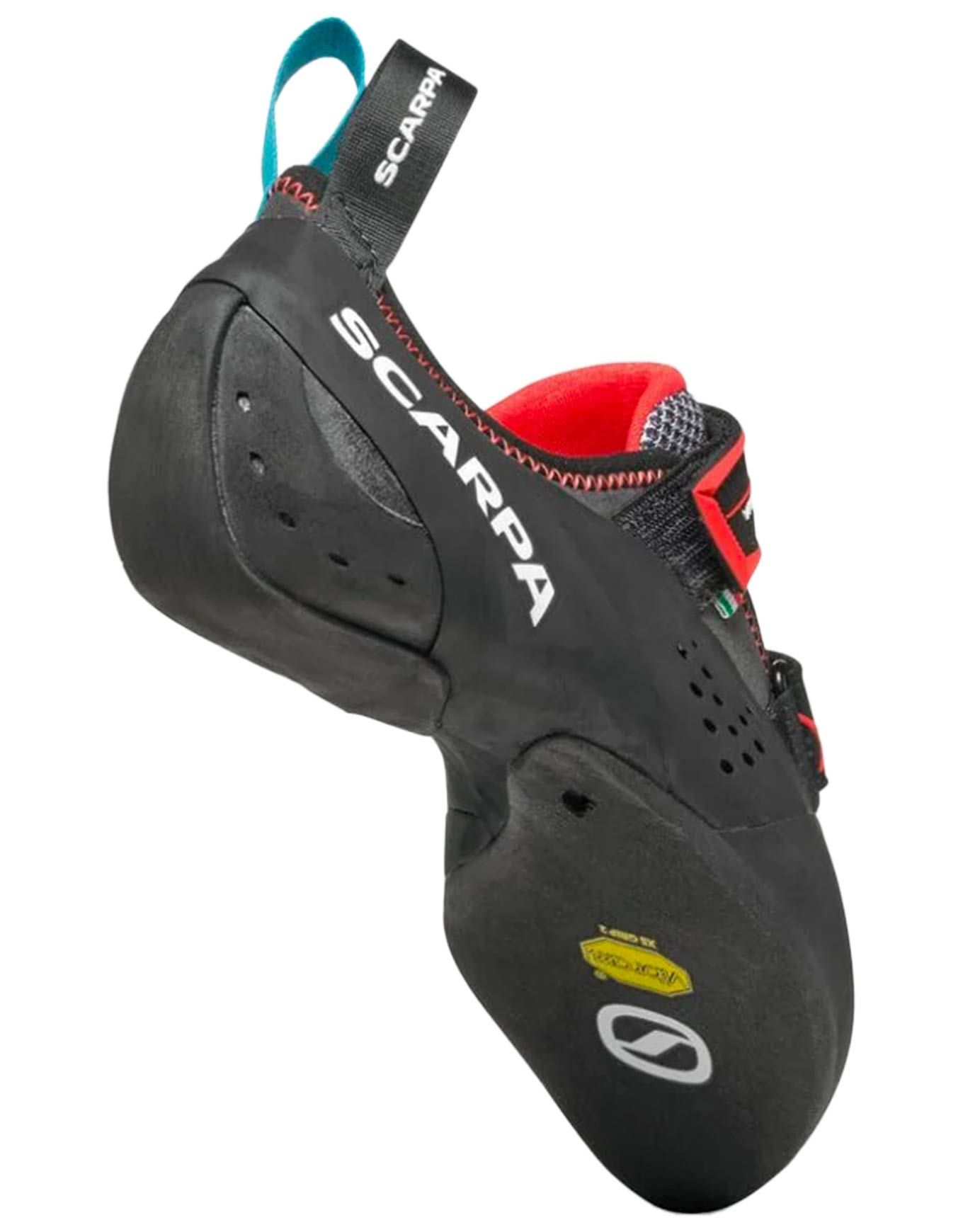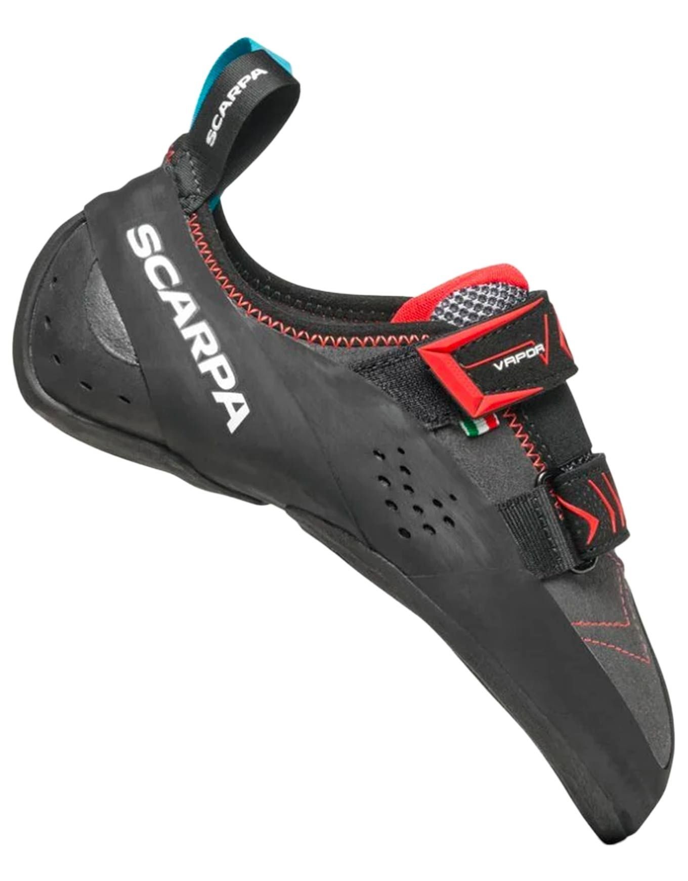 Chausson d’escalade Scarpa Vapor V LV Smoke Coral, profil bas pour pieds fins : talon affiné, construction souple, renfort orteil élargi, performant bloc, falaise et salle.