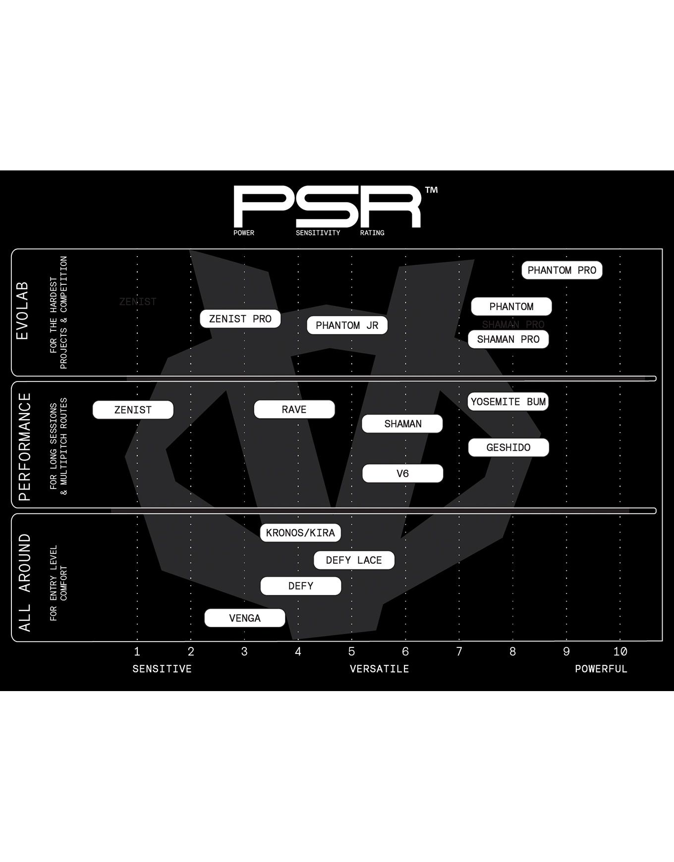 | PSR | Le Product Selection Rating (PSR) simplifie le choix des chaussons d'escalade en les classant d'après un code allant du « plus sensible au frottement » (1) au « plus puissant en appui » (10). 1-3 = sensible 4-7 = polyvalent 8-10 = puissant |