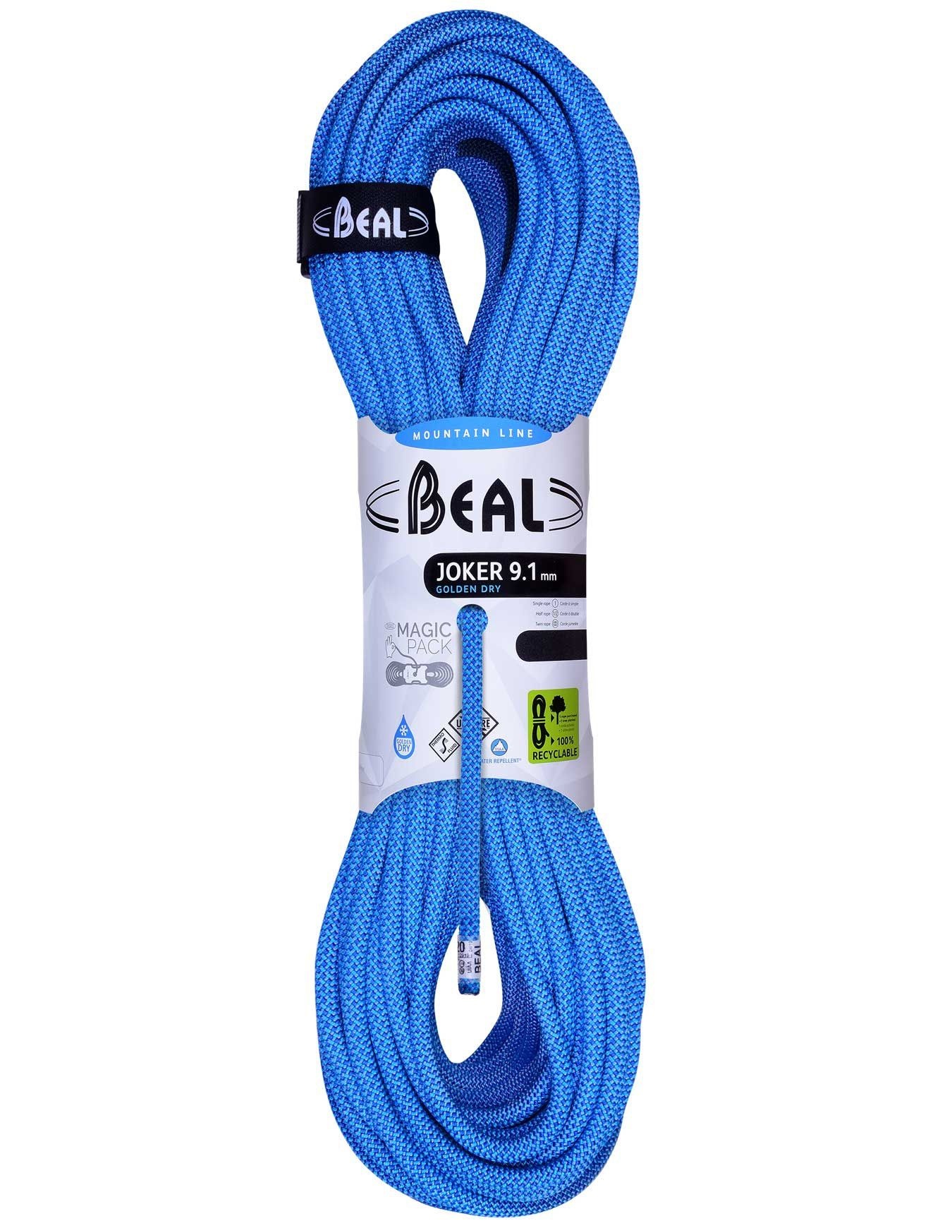 Corde Beal Joker Unicore 9,1 mm : ultra-légère, fluide et polyvalente, elle fonctionne en simple, double ou jumelée pour grimpeurs experts et alpinistes exigeants.