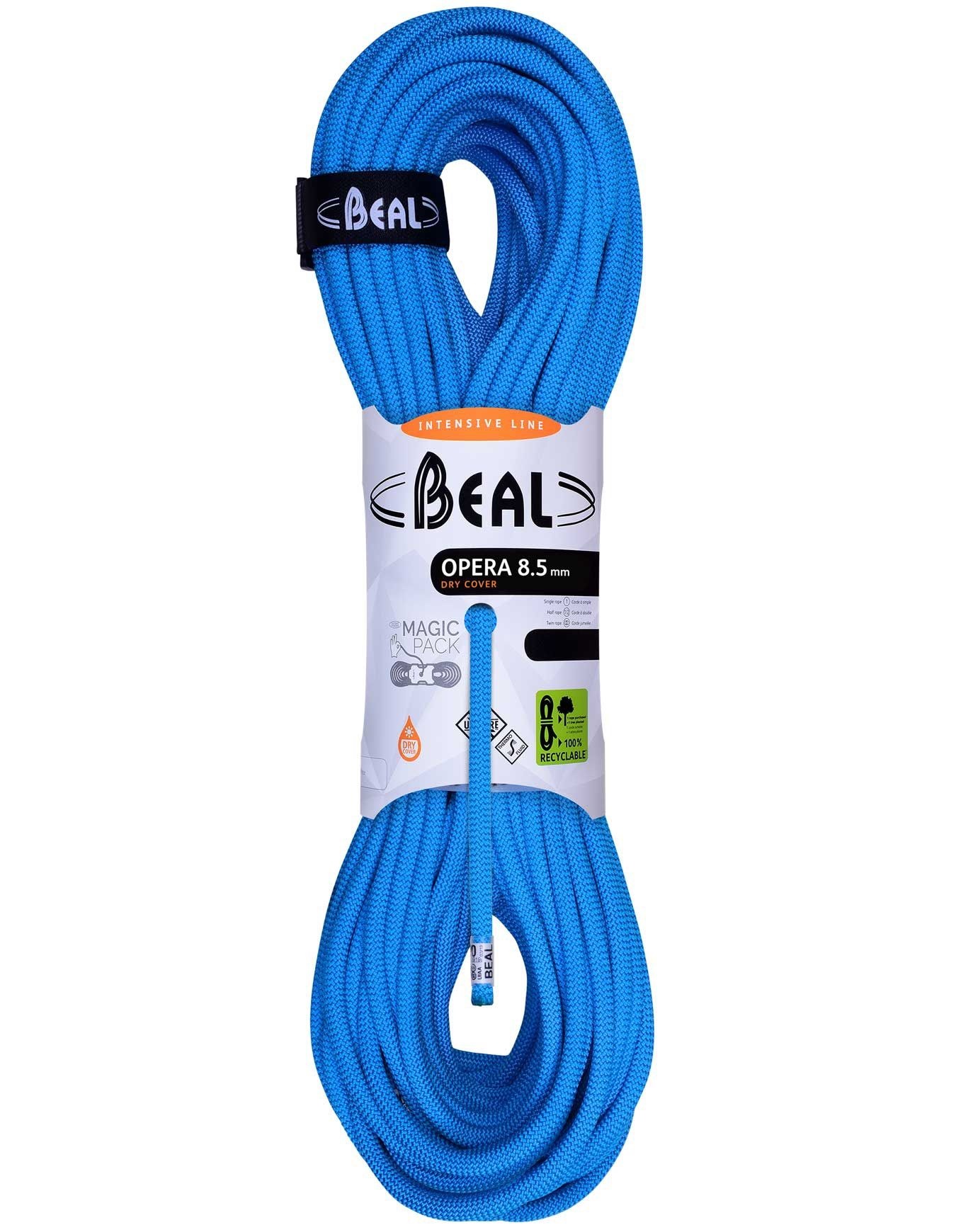 Corde Beal Opera 8.5 mm, la plus légère du marché à 48 g/m, conçue pour l’alpinisme et les grimpeurs experts. Traitement Dry Cover, technologie Unicore, faible force de choc.