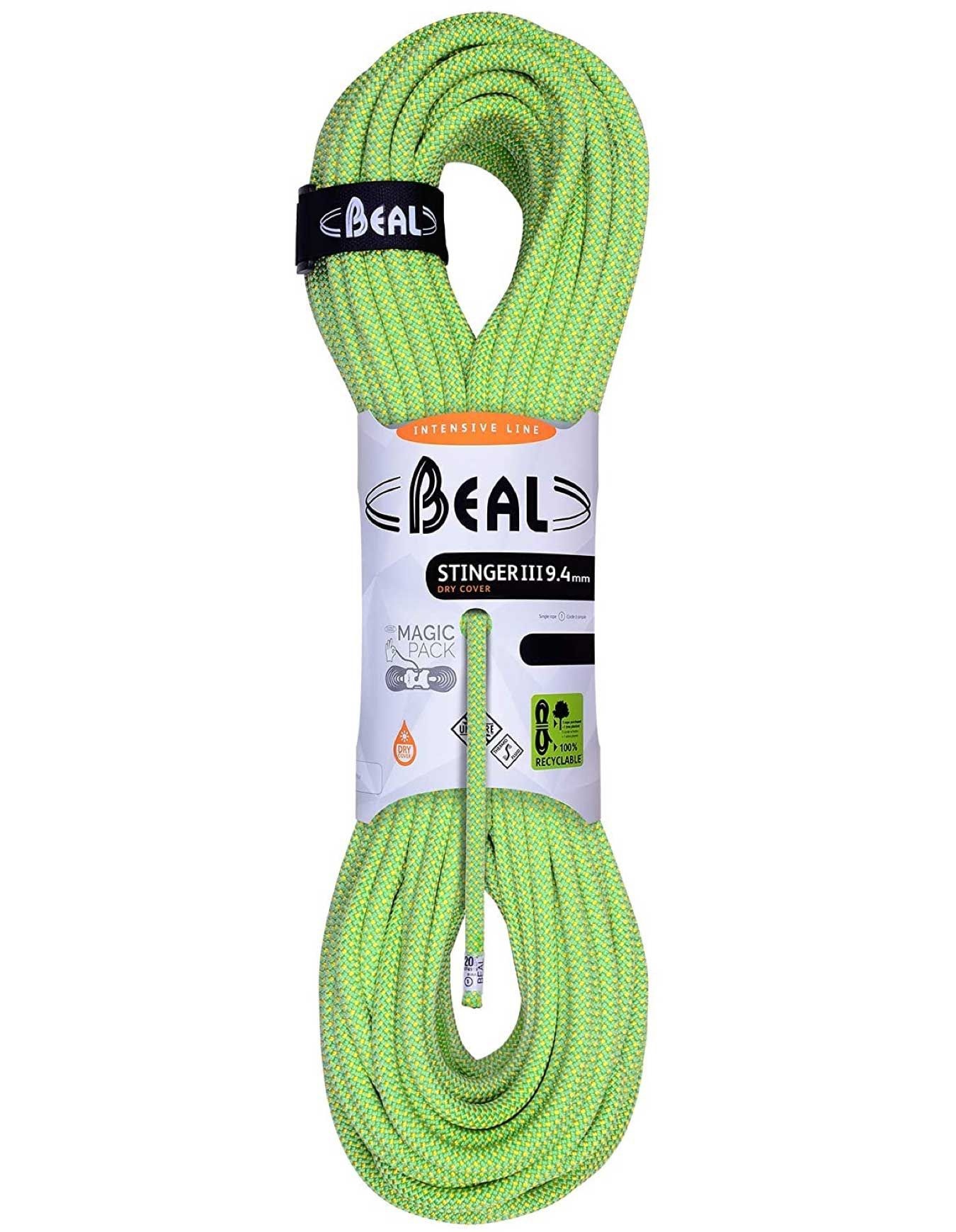 Corde à simple Beal Stinger III 9,4 mm conçue pour les grimpeurs experts : légère, fluide et polyvalente pour l’escalade comme l’alpinisme, avec technologie Unicore pour âme et gaine soudées, traitements Dry Cover et Thermo Fluid offrant résistance à l’abrasion, protection humidité et maniabilité compacte.
