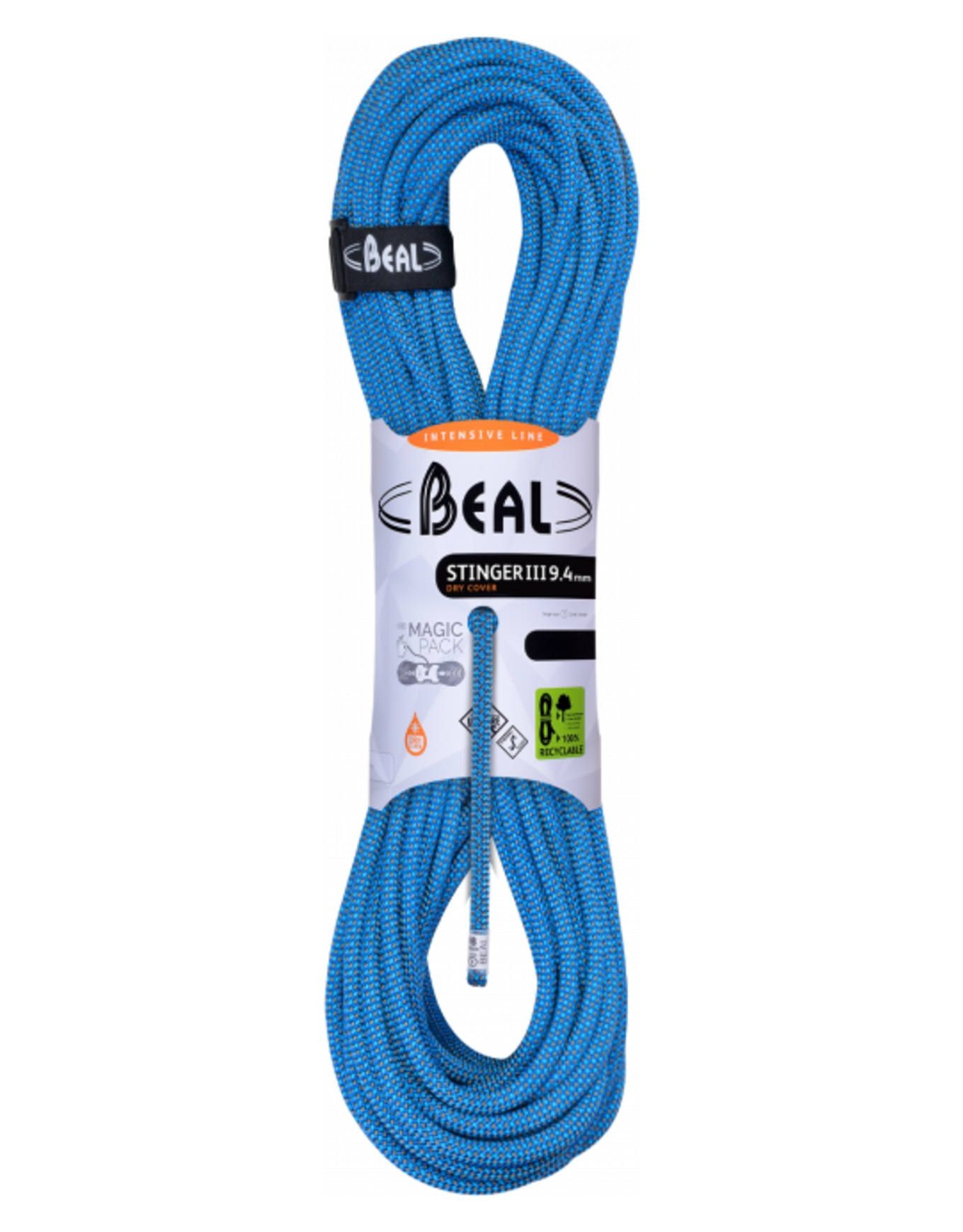 Corde à simple Beal Stinger III 9,4 mm conçue pour les grimpeurs experts : légère, fluide et polyvalente pour l’escalade comme l’alpinisme, avec technologie Unicore pour âme et gaine soudées, traitements Dry Cover et Thermo Fluid offrant résistance à l’abrasion, protection humidité et maniabilité compacte.