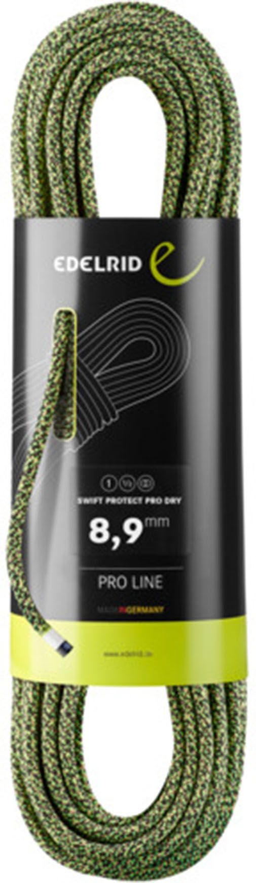 Corde d’escalade Edelrid Swift Protect Pro Dry 8,9 mm Night-Green, traitement Pro Dry UIAA, aramide renforcée contre les arêtes, utilisable simple, double ou jumelée.